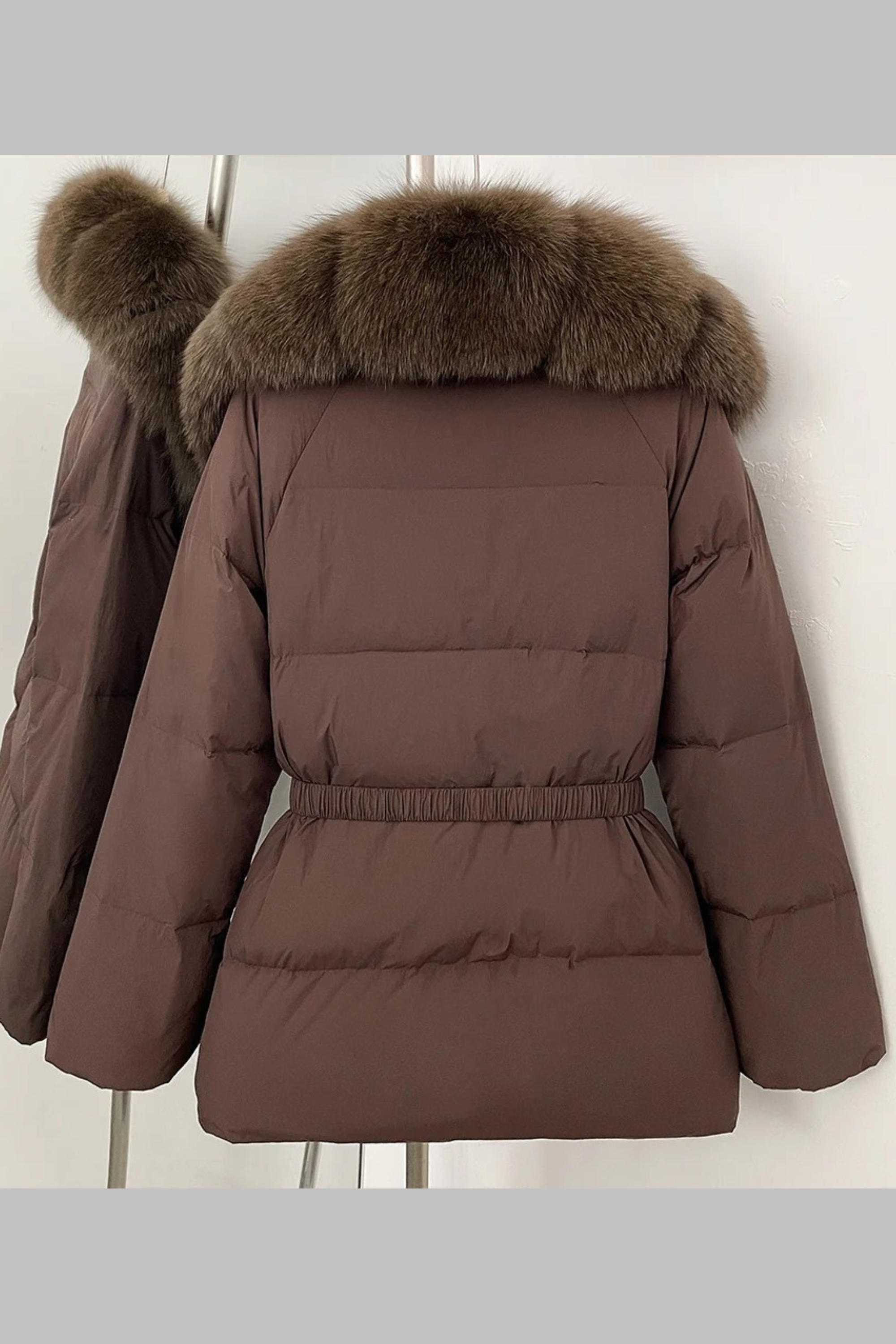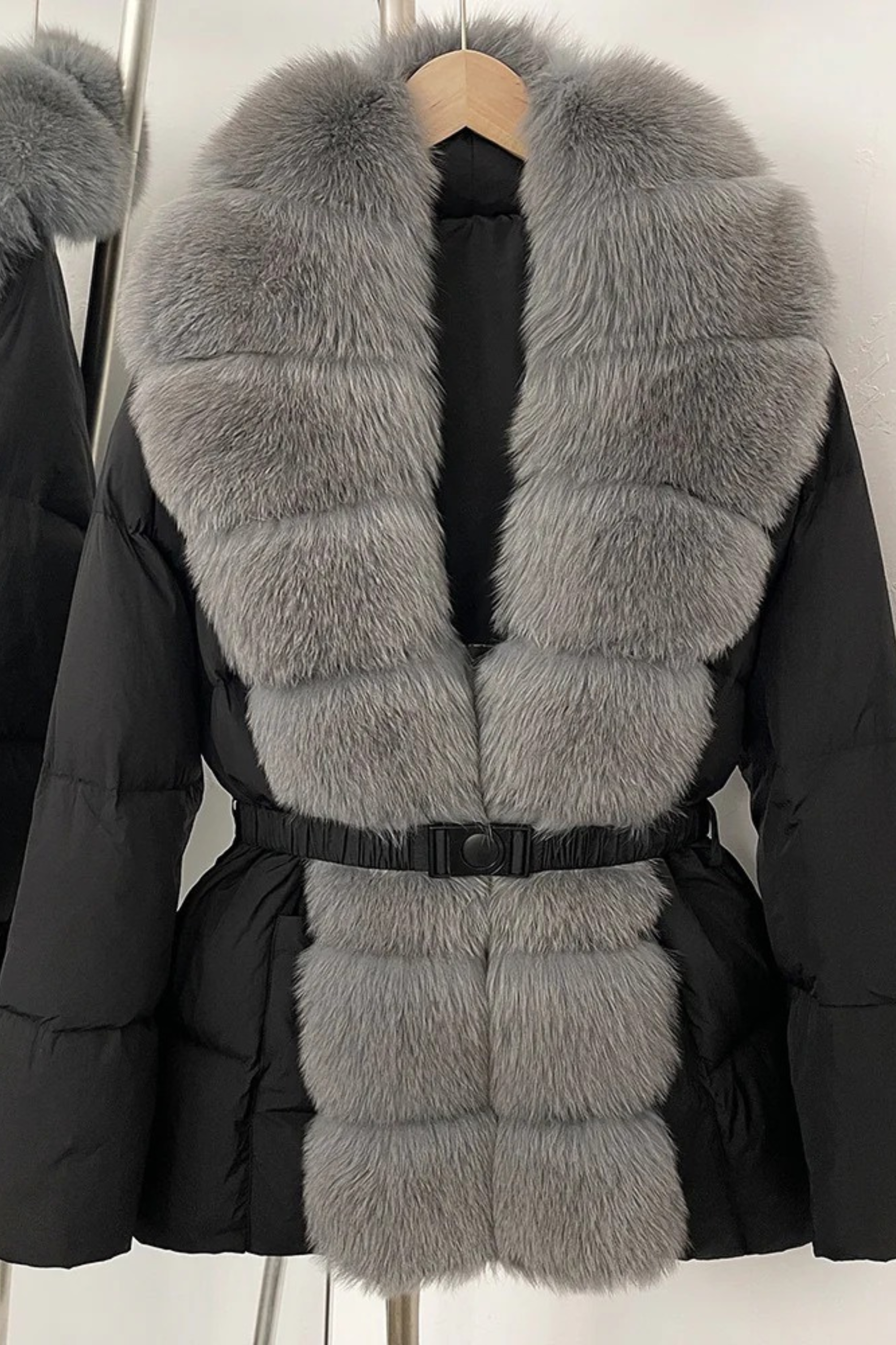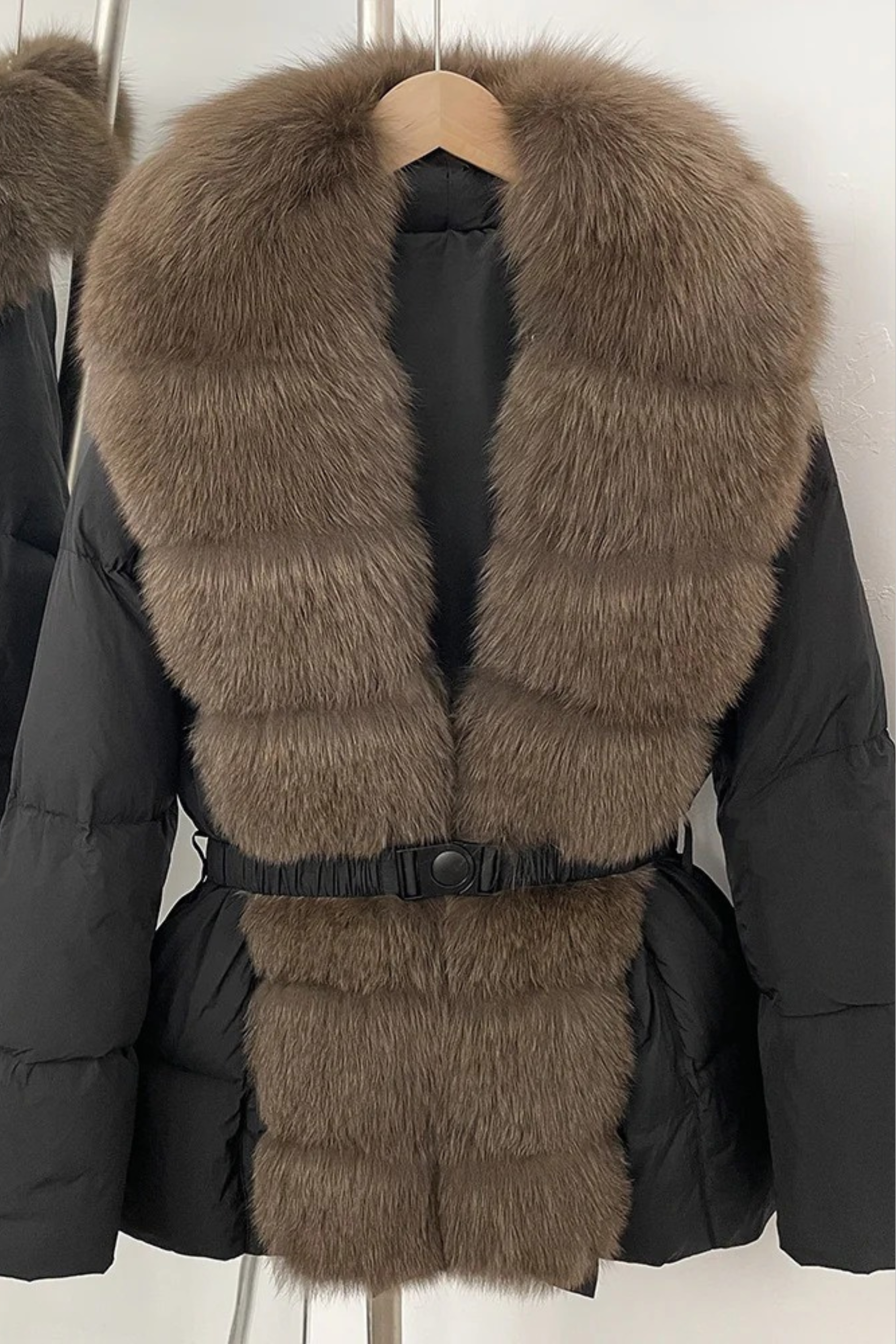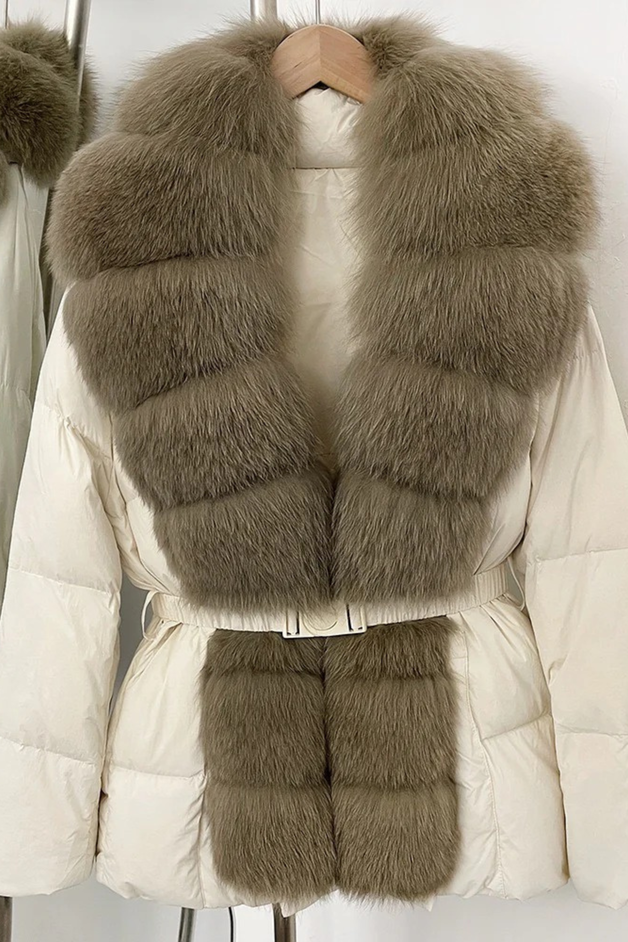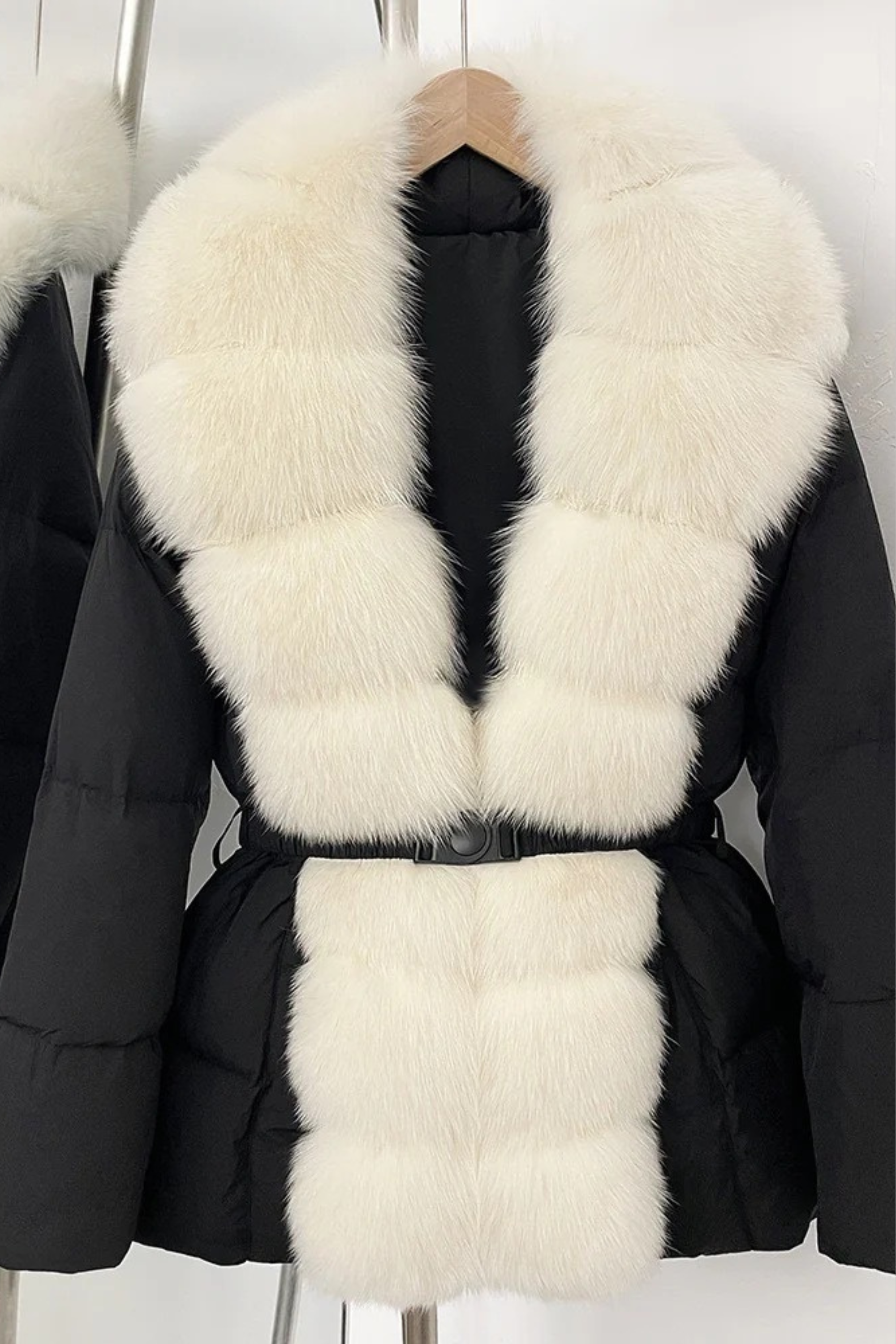 Elegant and ultra-cozy, this belted puffer jacket combines warmth with sophisticated style. Designed with a plush faux fox fur collar and matching front trim, it offers the luxurious look of real fur in a cruelty-free design. The adjustable belt cinches the waist for a flattering silhouette, while the quilted padding ensures comfort and insulation through cold-weather days.