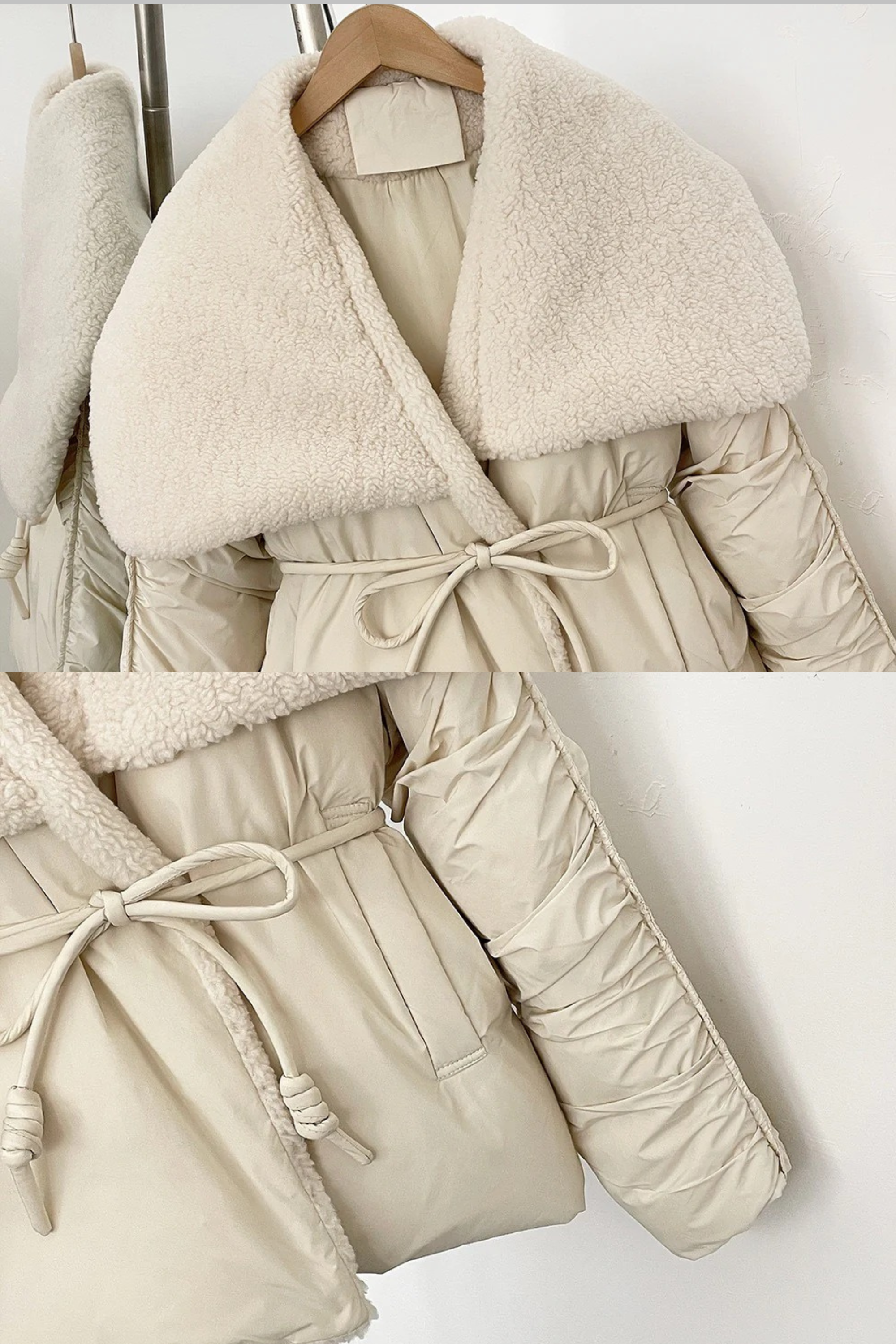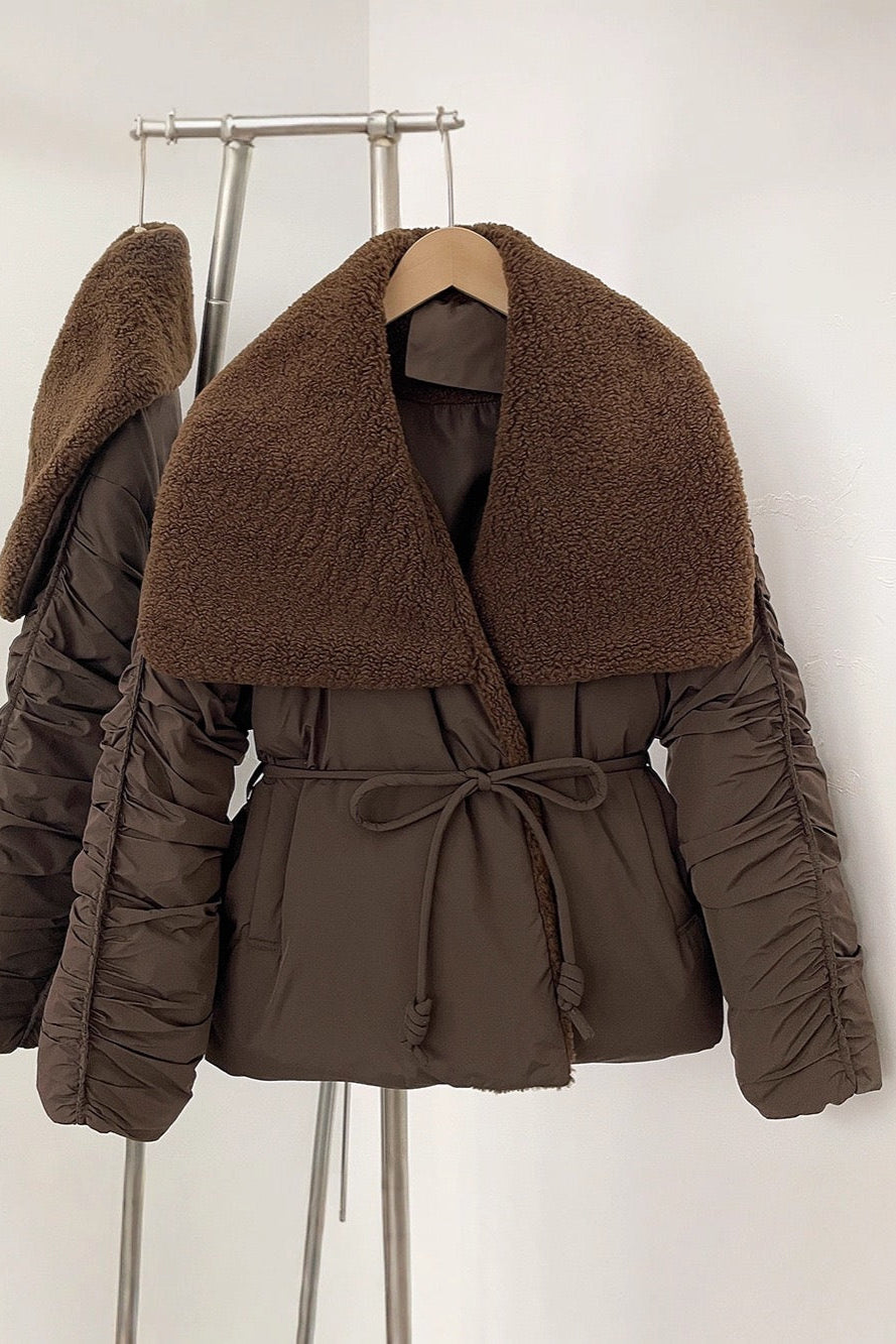 Stay warm in style with this chic belted puffer jacket featuring an oversized faux shearling collar that adds a soft, luxurious touch. The ruched sleeves bring subtle texture, while the adjustable waist tie flatters your figure and keeps warmth in. Designed in a relaxed one-size fit for effortless layering and comfort.