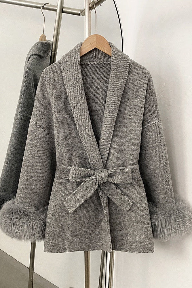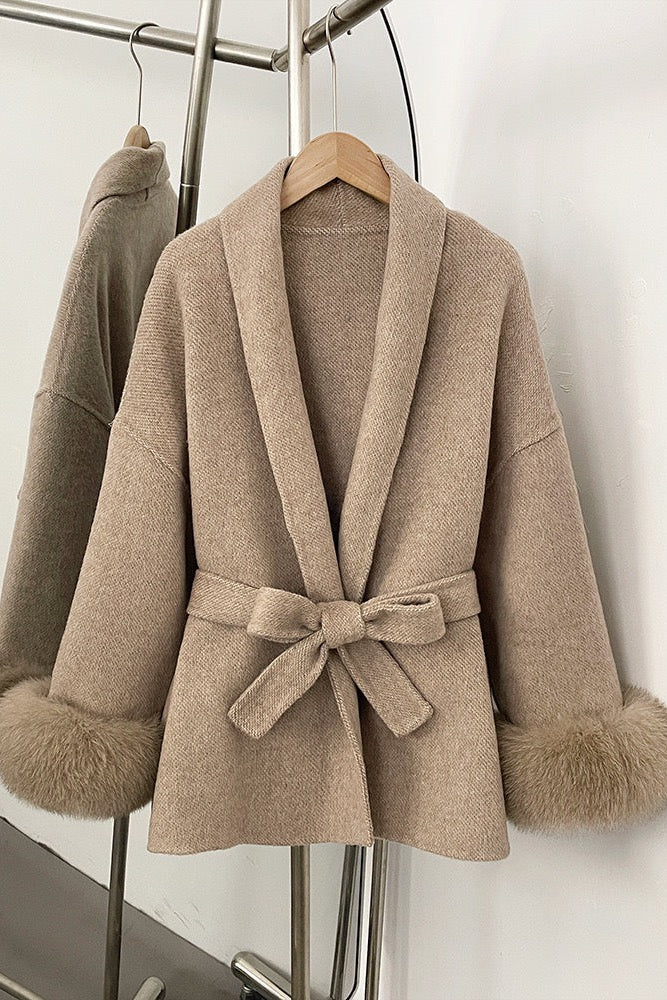 Elevate your winter look with this soft wool-blend coat featuring plush faux fur cuffs and a classic shawl collar. Designed with a self-tie belt for a flattering silhouette, this elegant wrap-style jacket blends cozy warmth with sophisticated charm. Perfect for pairing with dresses or denim for a chic, polished finish.