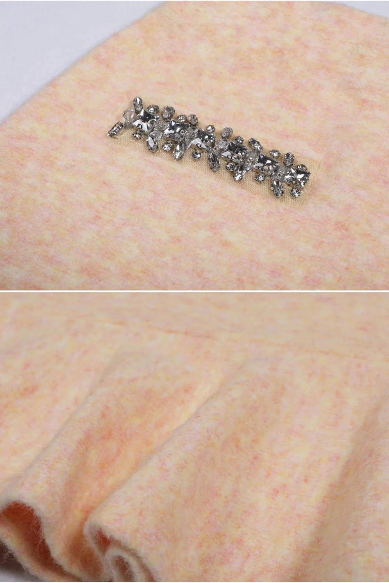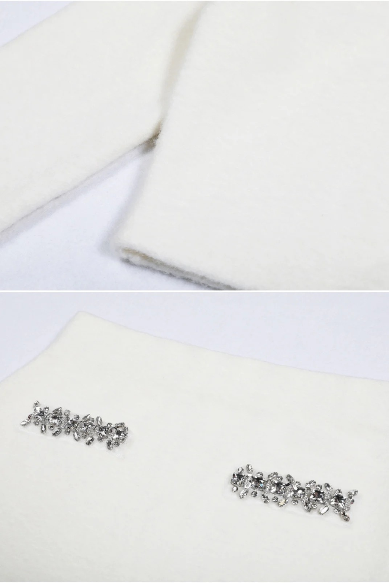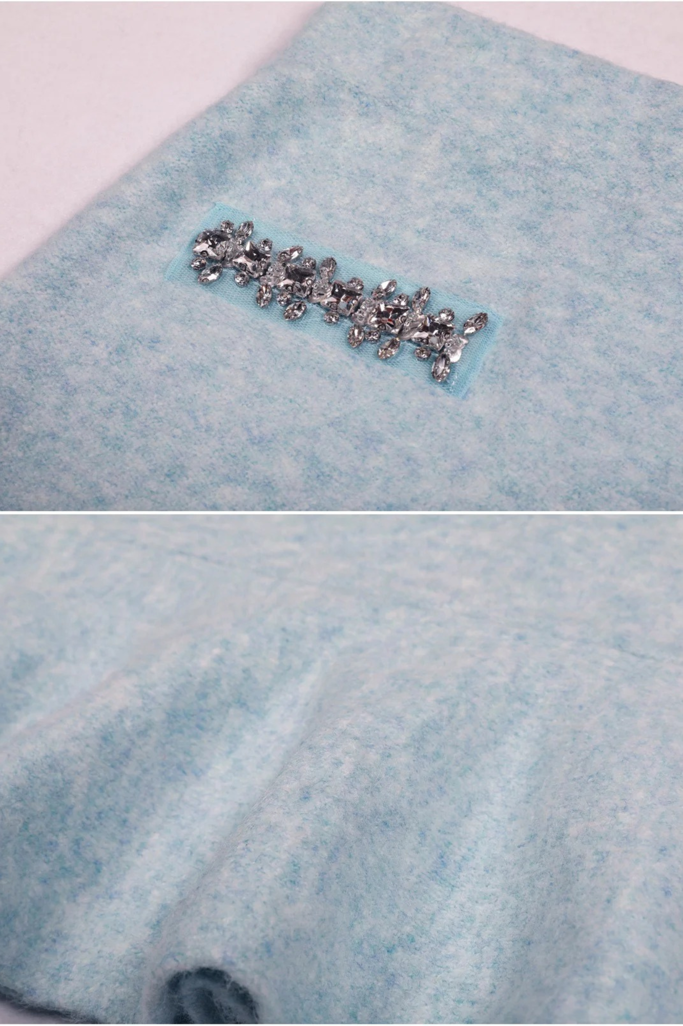 Elegant and refined, this two-piece soft wool set features a long-sleeve cropped jacket with crystal embellishments along the neckline, front, and faux pockets, paired with a high-waist mini skirt finished with a delicate ruffled hem. Crafted from plush soft wool fabric, it offers a smooth, cozy feel with a luxurious appearance. Perfect for brunches, chic gatherings, or winter outings, this set blends comfort with sophisticated sparkle. Available in sky blue, blush peach, and ivory white.
