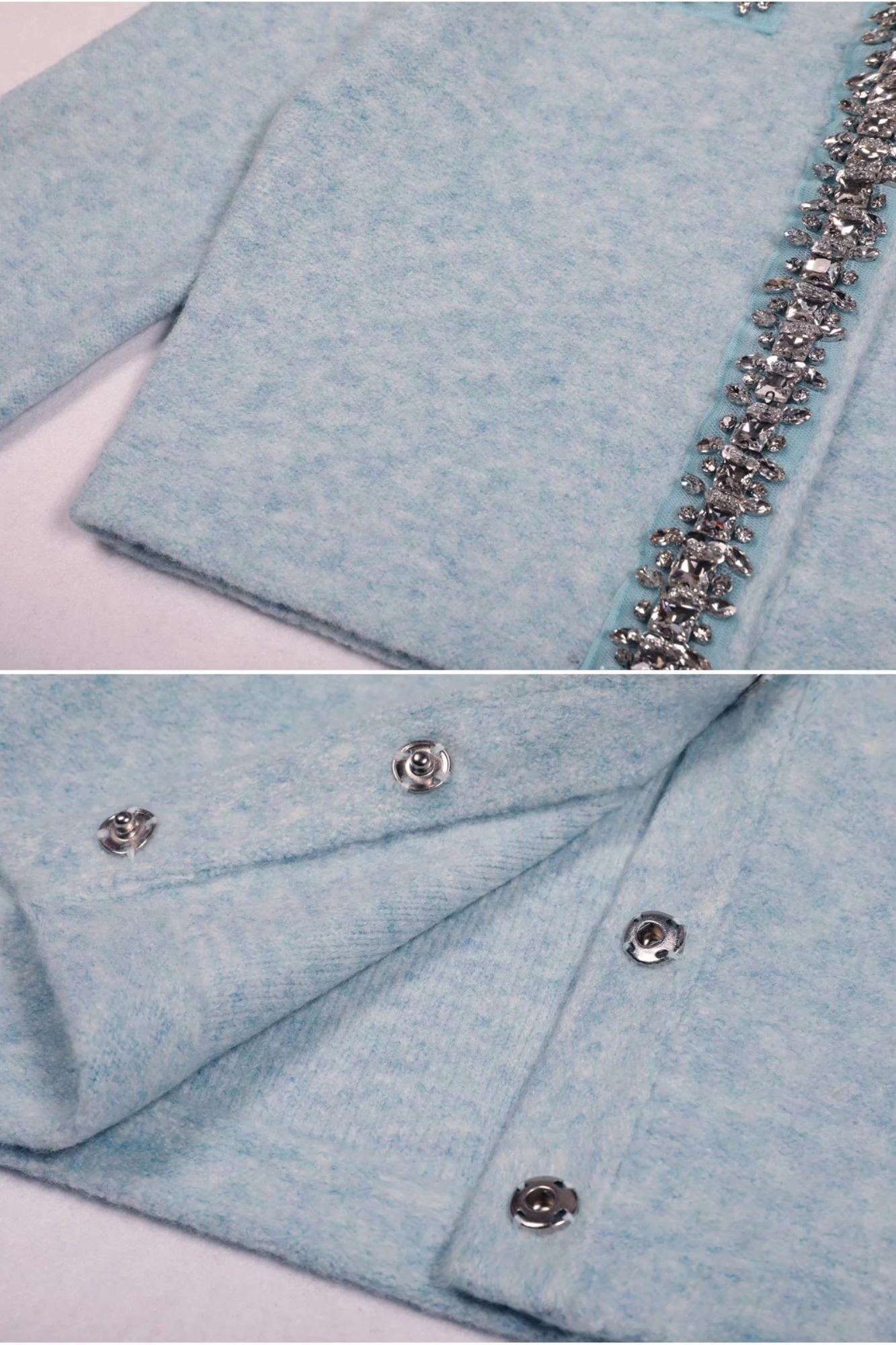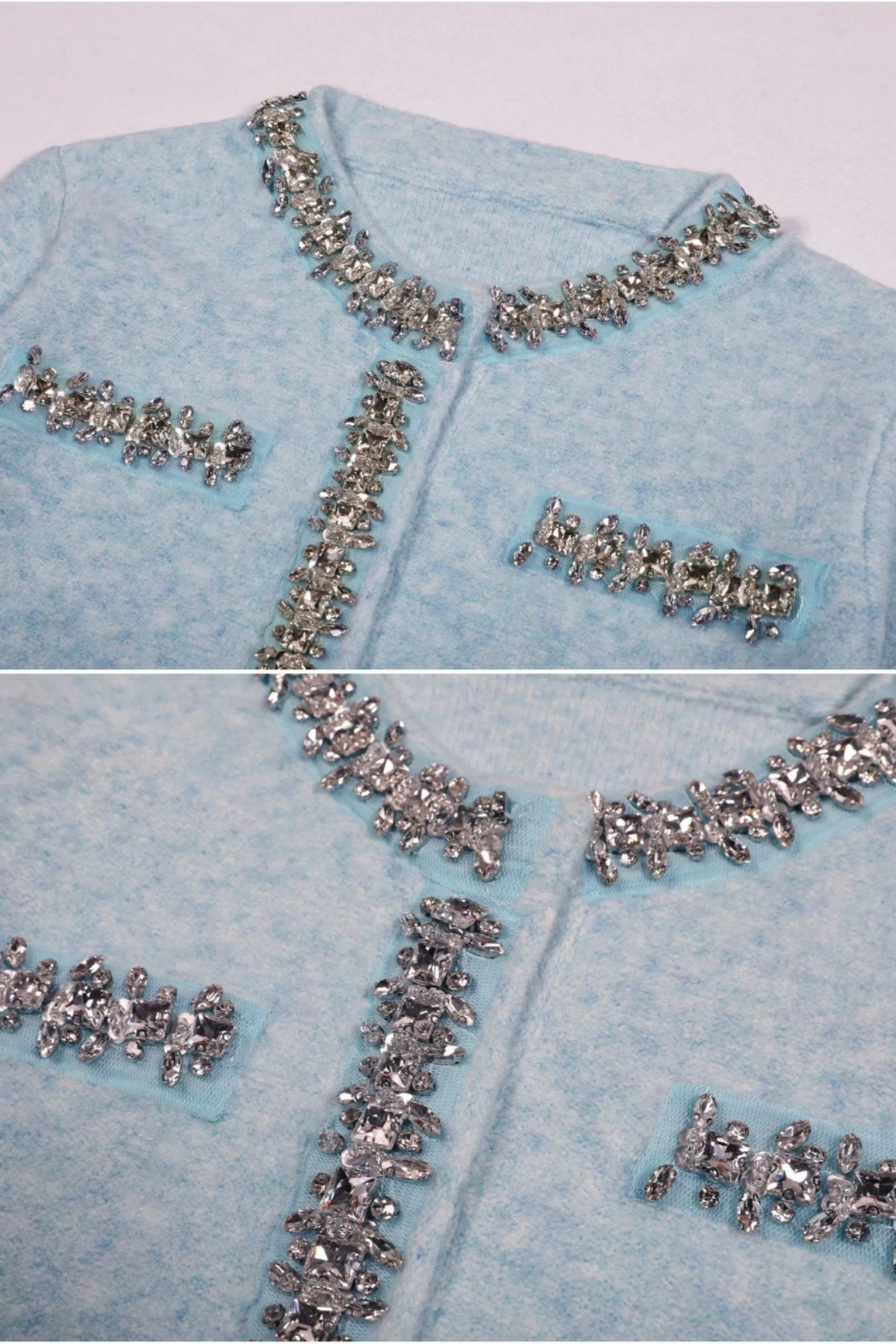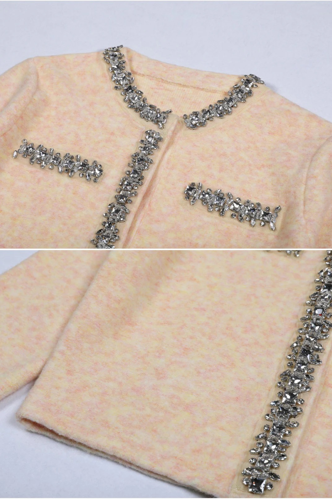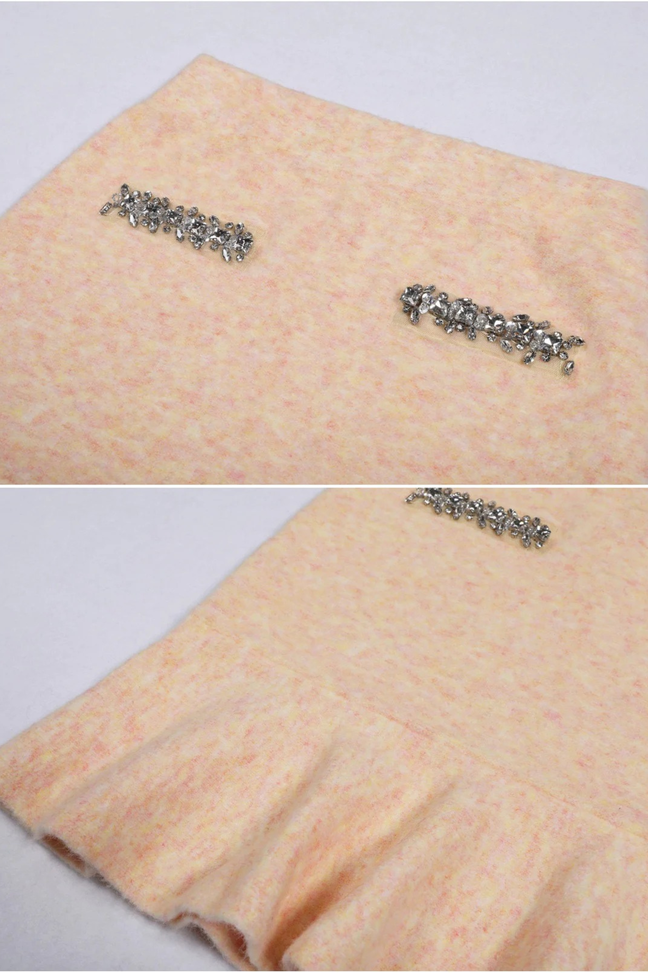 Elegant and refined, this two-piece soft wool set features a long-sleeve cropped jacket with crystal embellishments along the neckline, front, and faux pockets, paired with a high-waist mini skirt finished with a delicate ruffled hem. Crafted from plush soft wool fabric, it offers a smooth, cozy feel with a luxurious appearance. Perfect for brunches, chic gatherings, or winter outings, this set blends comfort with sophisticated sparkle. Available in sky blue, blush peach, and ivory white.