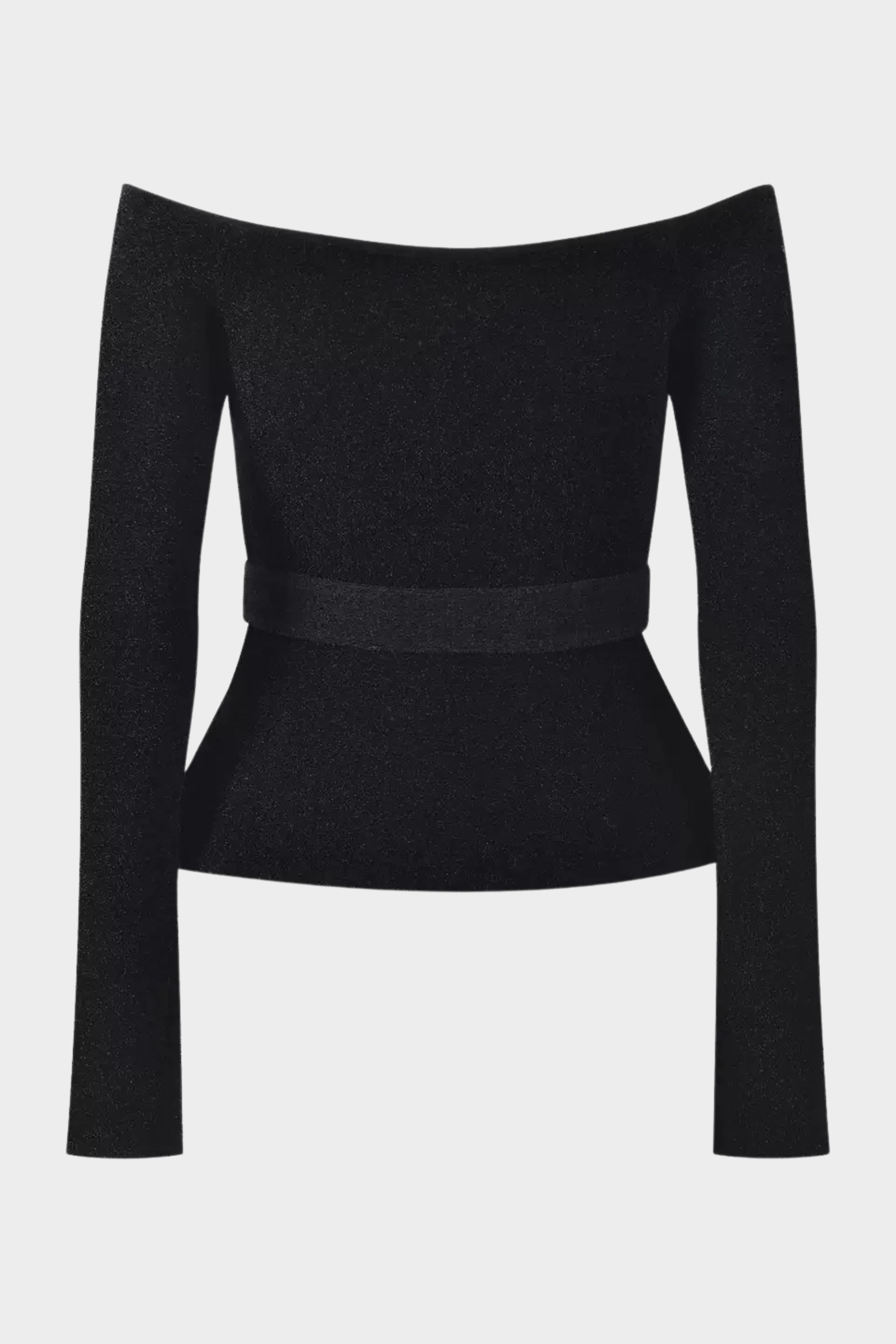 Embellished Off-Shoulder Knit Top with Belt – Elegant Winter Sweater