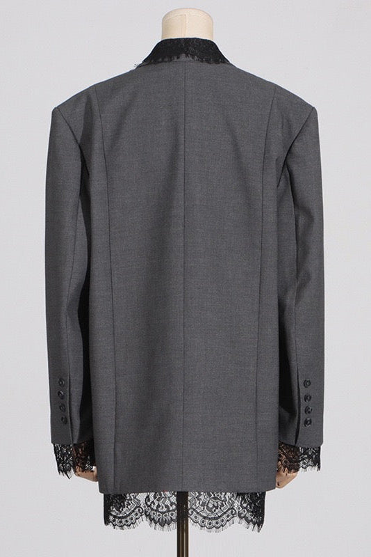 Exude refined elegance with this lace-trimmed oversized blazer, designed with a perfect balance of structure and femininity. The classic tailored silhouette features a deep V-lapel edged in intricate black lace that continues along the cuffs and hem for a romantic contrast. Crafted from premium woven fabric with a smooth drape, it’s ideal to wear as a statement blazer or styled as a chic mini dress for evening looks.