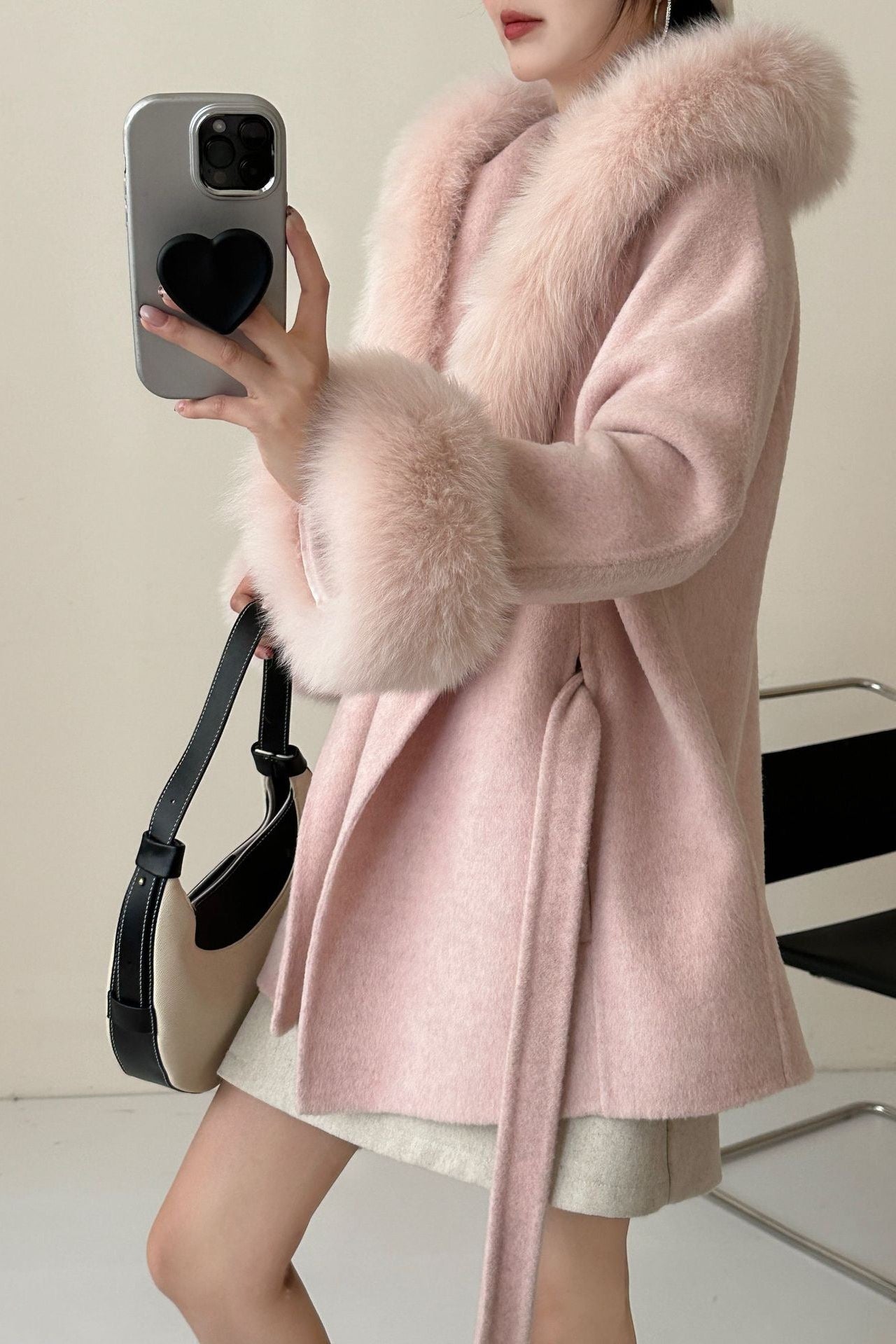 Stay warm and effortlessly chic in this soft wool-blend wrap coat, featuring a plush faux fur trim along the hood and cuffs for a luxurious touch. The relaxed silhouette is enhanced with a self-tie belt that cinches at the waist for a flattering fit. Perfect for both casual and elegant outings, this coat combines cozy comfort with timeless sophistication.