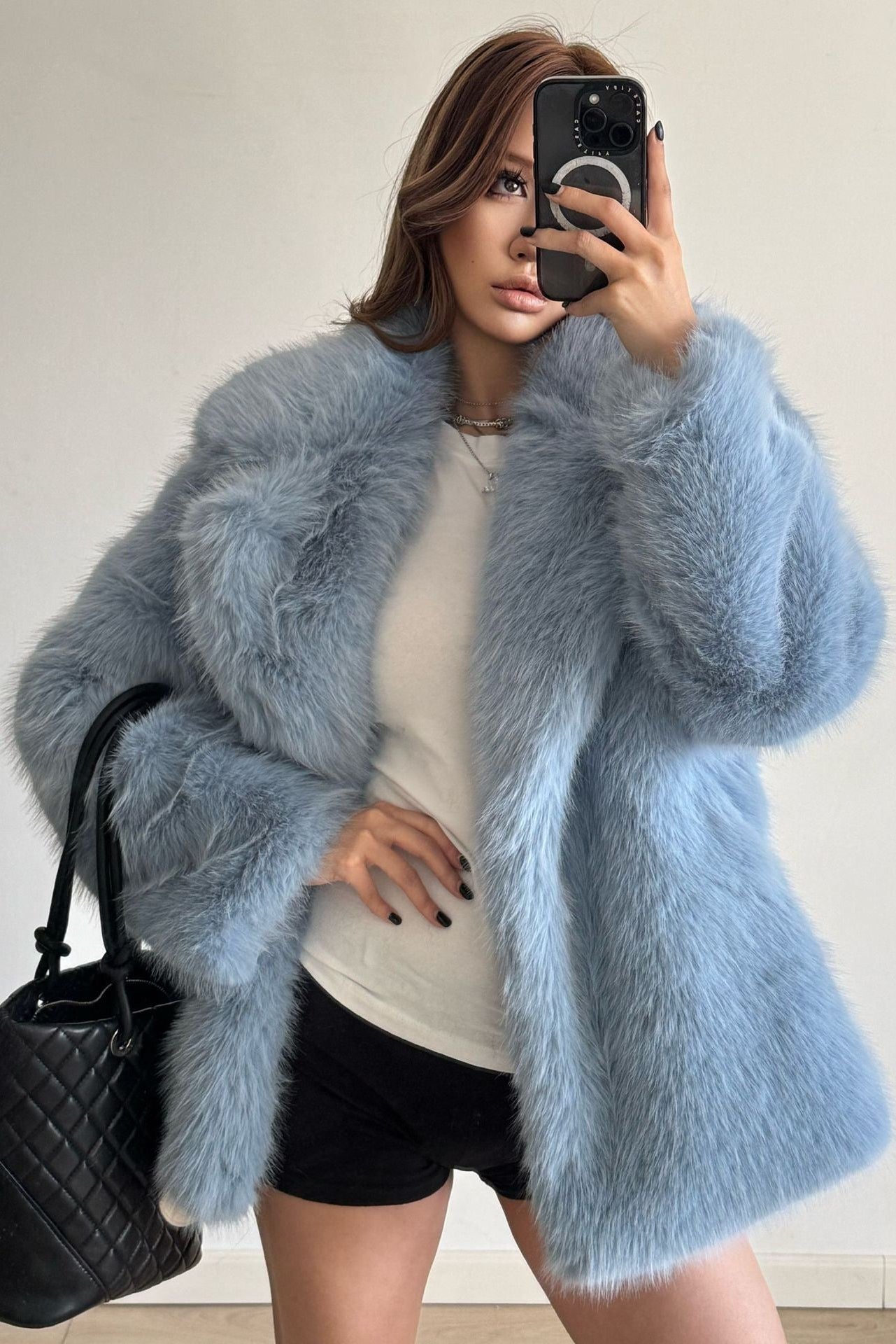 A luxurious oversized faux-fur coat crafted from ultra-soft, high-pile fabric for a plush and cozy feel. Featuring a wide lapel collar and relaxed silhouette, it adds instant glamour and warmth to any outfit. Perfect for pairing with boots or heels for chic winter looks. Available in soft pastel shades like butter yellow and powder blue.