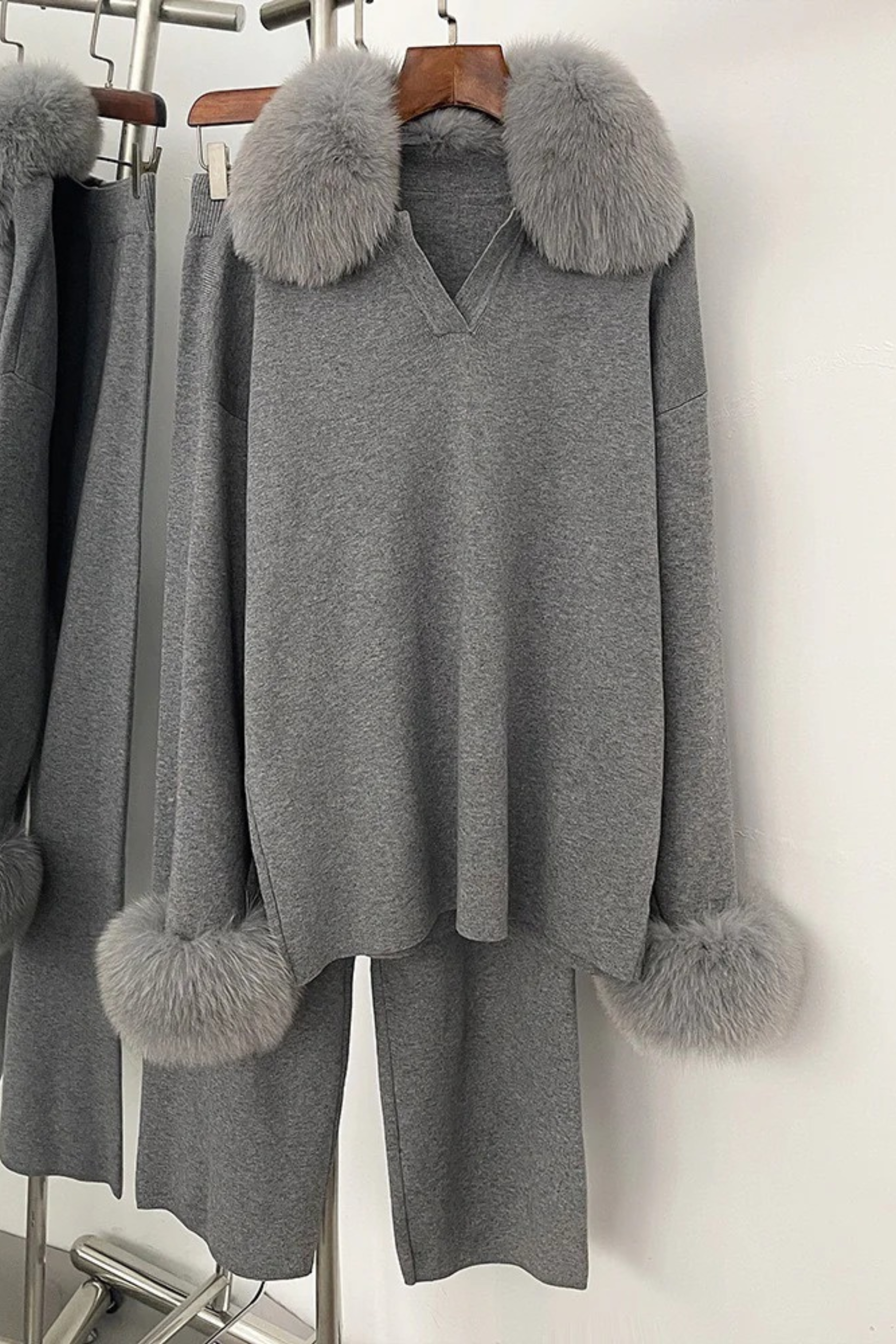 Elevate your winter style with this luxurious knit two-piece set, designed for effortless elegance and cozy sophistication. The soft knit fabric offers warmth and comfort, while the plush faux fur trim on the collar and cuffs adds a glamorous, high-end touch.