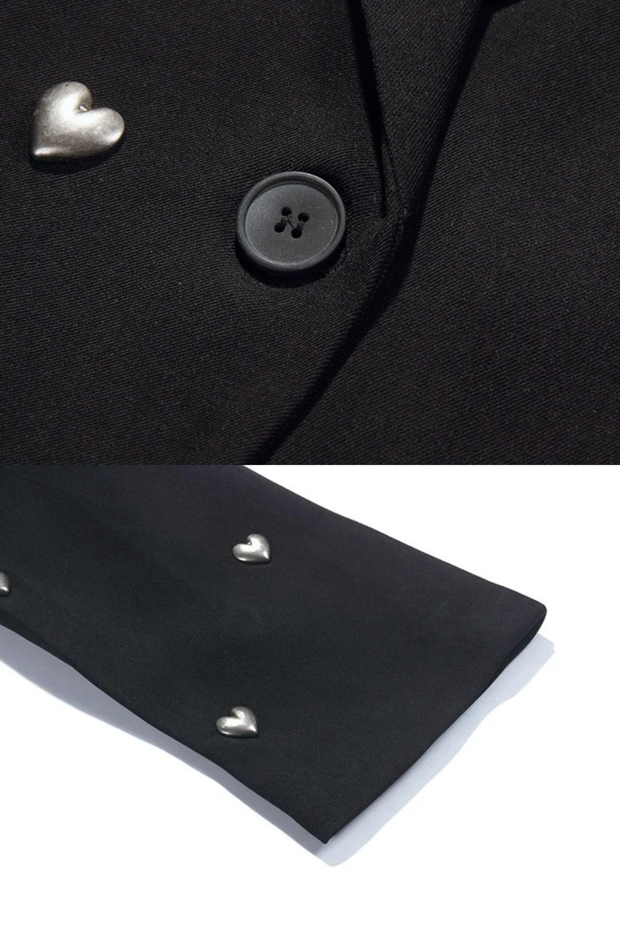 Turn heads with this statement black blazer adorned with metallic heart embellishments. Designed with bold structured shoulders, a deep V-lapel, and a flattering longline silhouette, it blends sophistication with playful edge. Crafted from a smooth tailored fabric, this piece can be styled as a mini blazer dress or layered over fitted separates for a chic evening look.