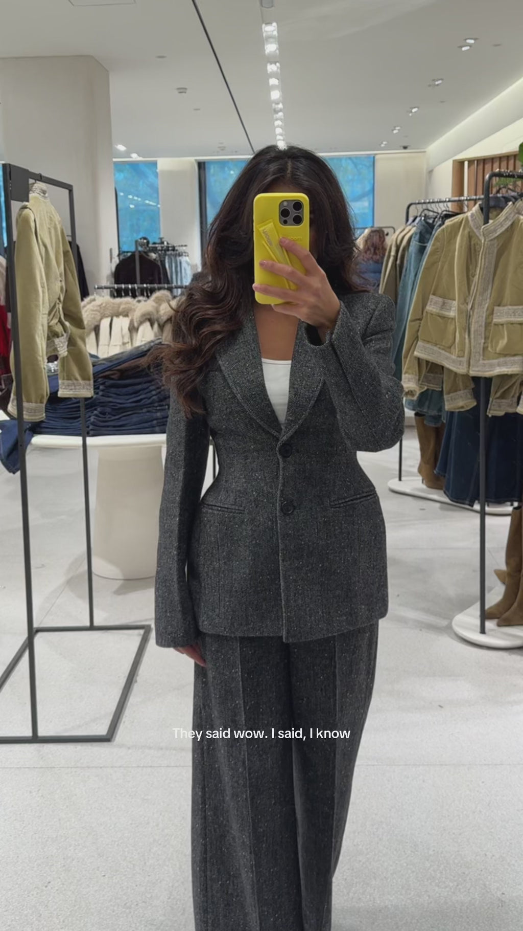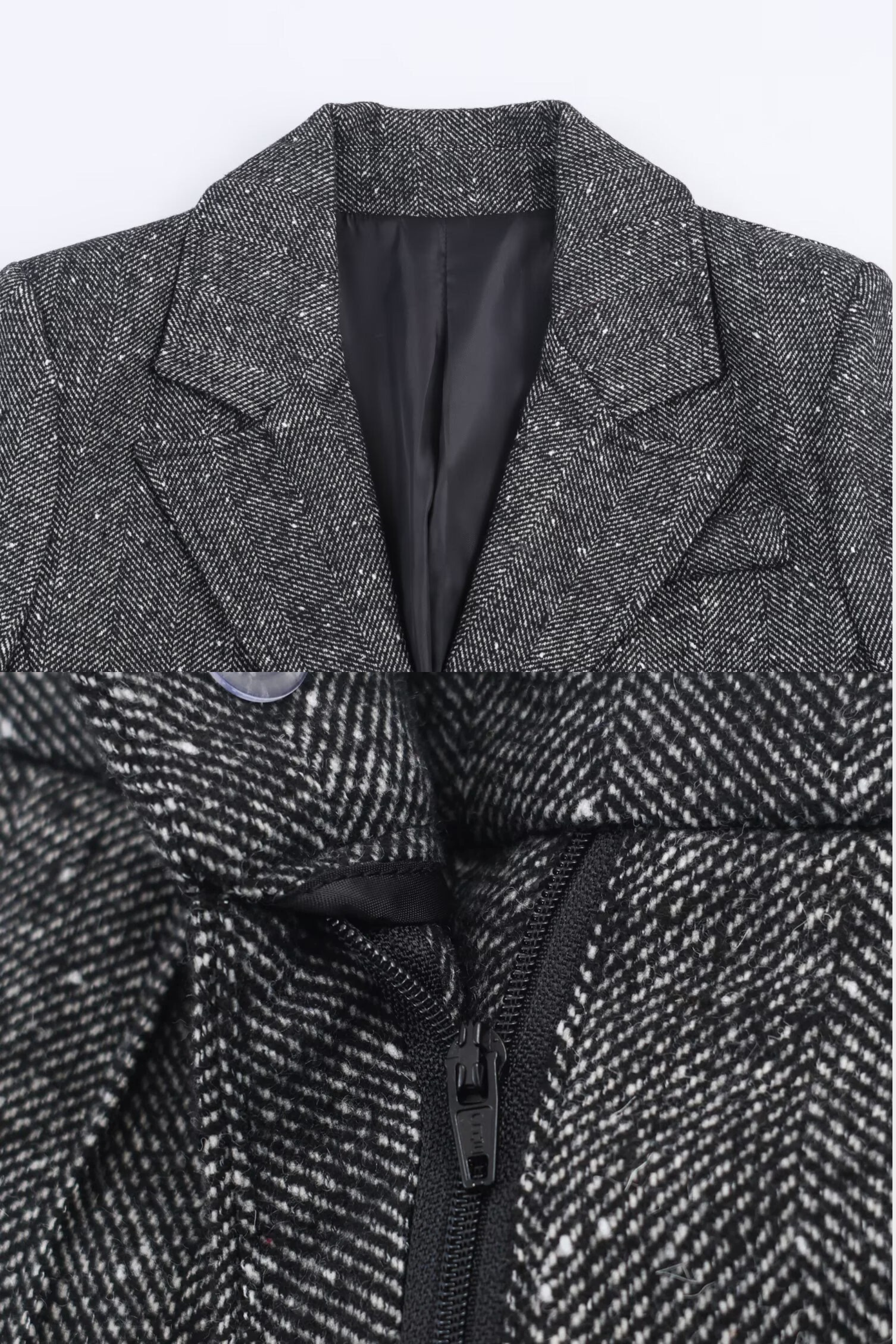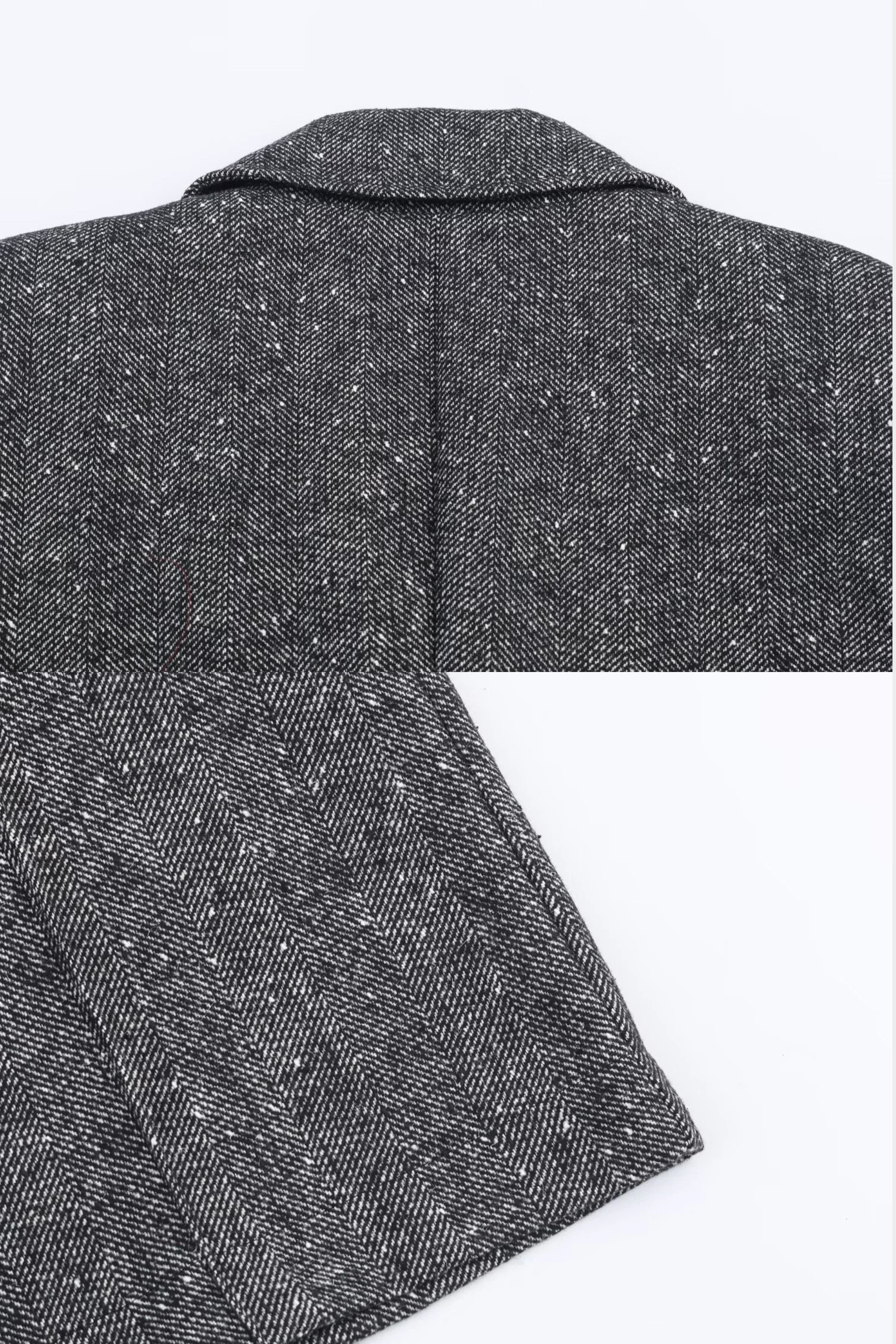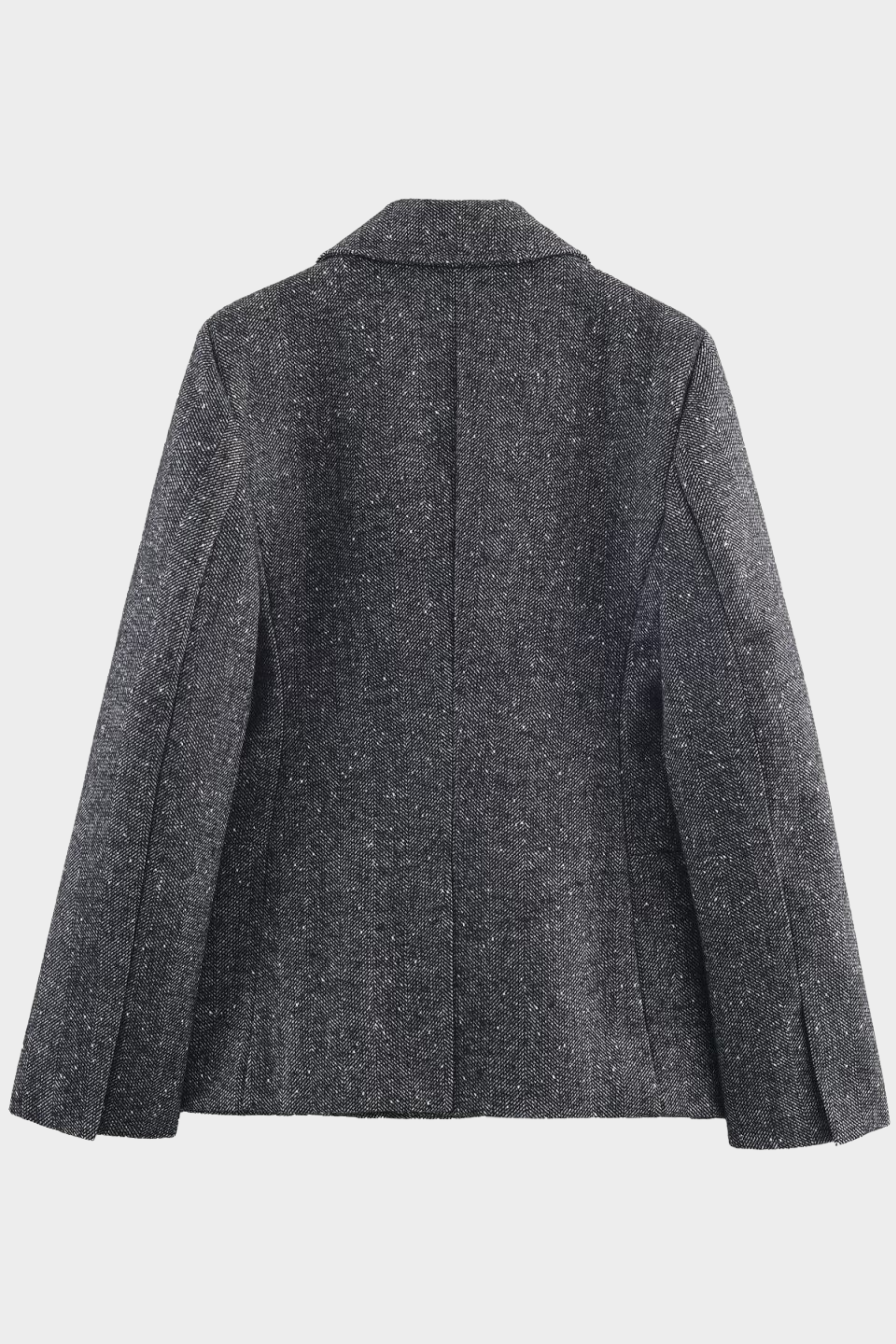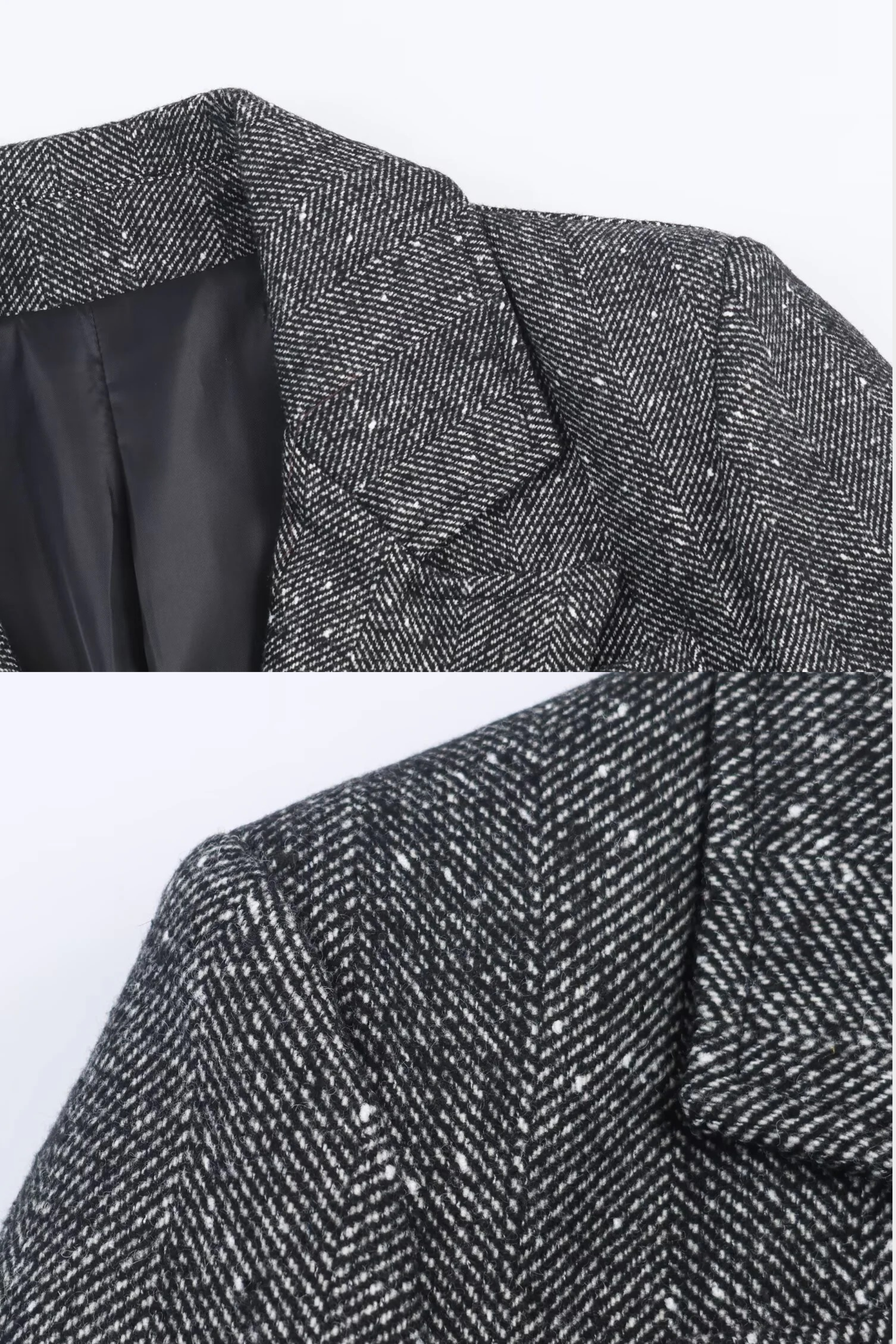 A beautifully tailored tweed blazer designed with a structured silhouette, notched lapels, and refined front buttons. Finished with slim welt pockets and a smooth inner lining, it adds a polished, timeless edge to both office and evening looks.