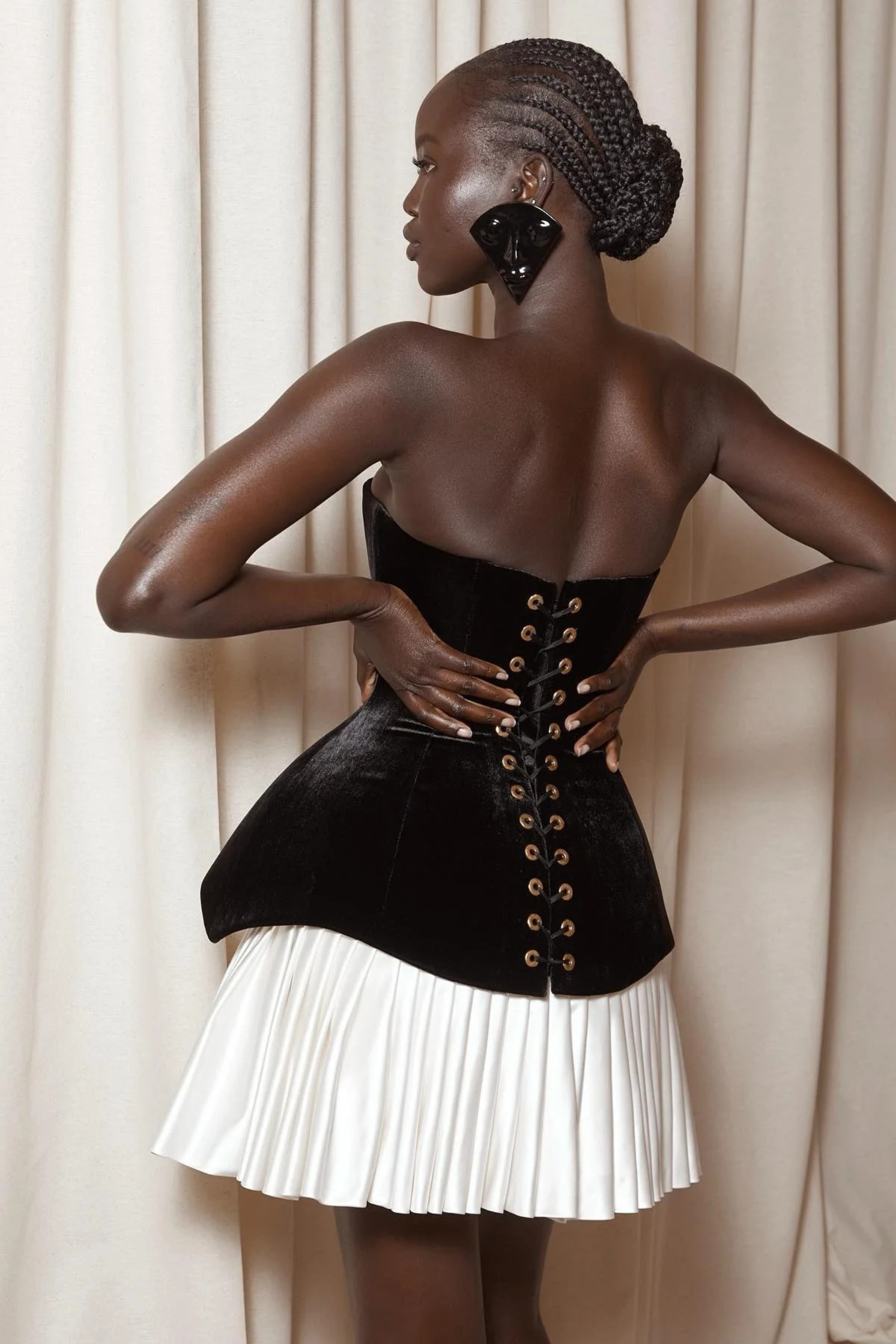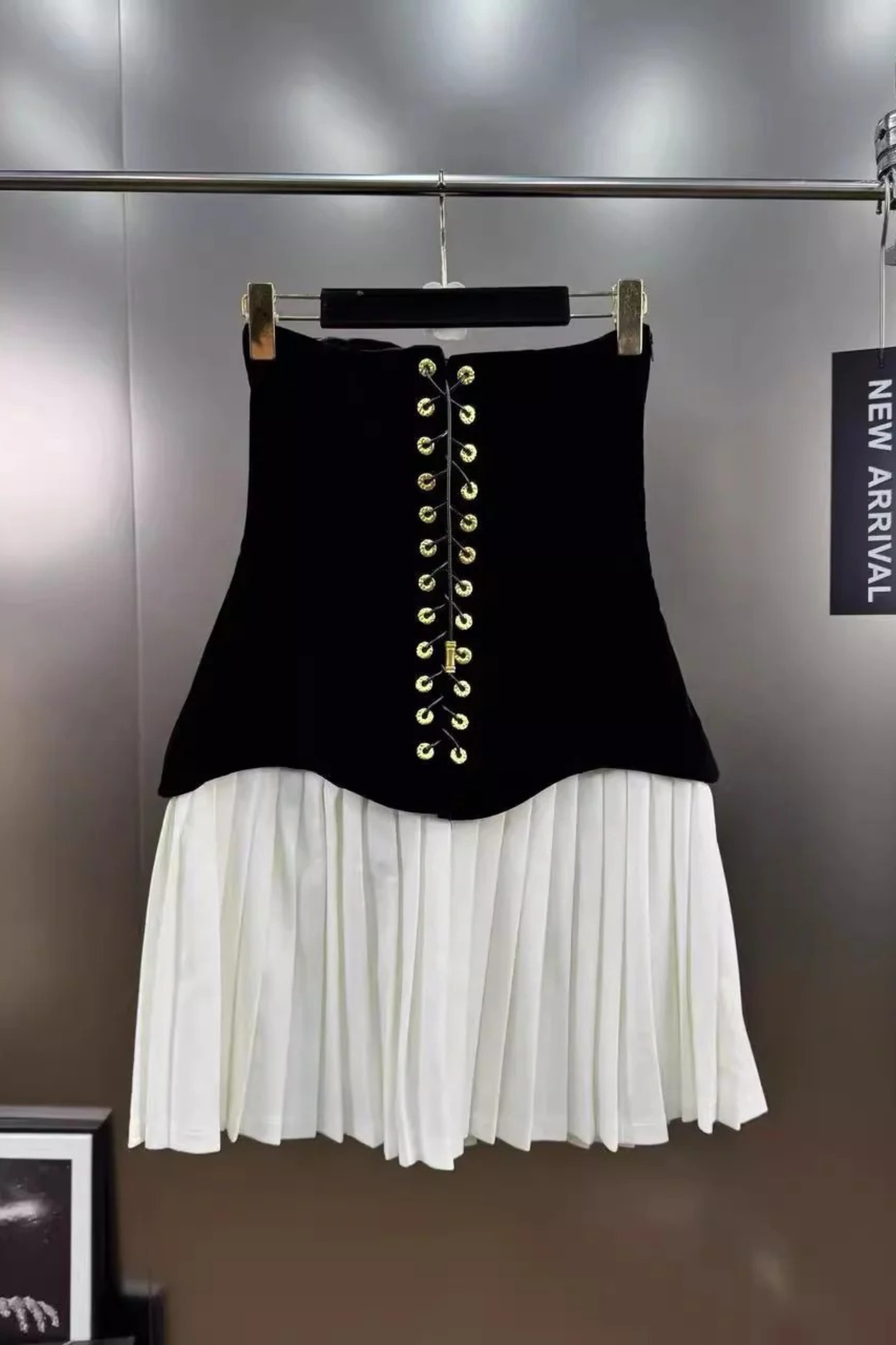 Elevate your look with this luxury velvet corset mini dress, designed with a structured sleeveless bodice and a crisp pleated skirt for a chic, feminine silhouette. The top features soft black velvet, gold eyelet lace-up detailing at the back, and a sculpted fit that shapes the waist beautifully. The contrast white pleated hem adds movement and elegance, making it perfect for evenings, events, and modern chic styling. Crafted from velvet and lightweight pleated fabric, this dress blends comfort, structure, and sophistication in one standout piece.