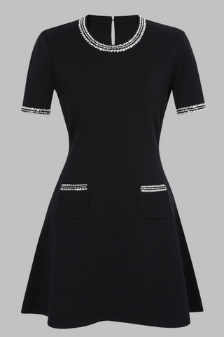Navy Beaded Hollow Crochet Knit Mini Dress with Crystal Embellishments and Square Neckline