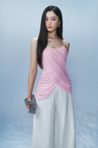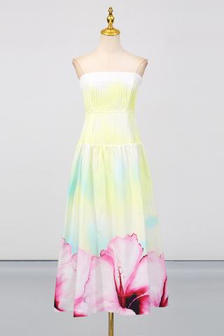 Strapless Pleated Bodice Gradient Long Dress with Oversized Floral Hem