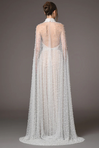 Heavy Pearl-Embroidered Mesh Tulle Long Dress with High Collar and Draped Cape