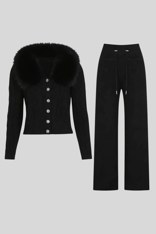 Zip-Front Hooded Knit Set with Faux Fur Trim – Long Sleeve Top & Wide-Leg Pants