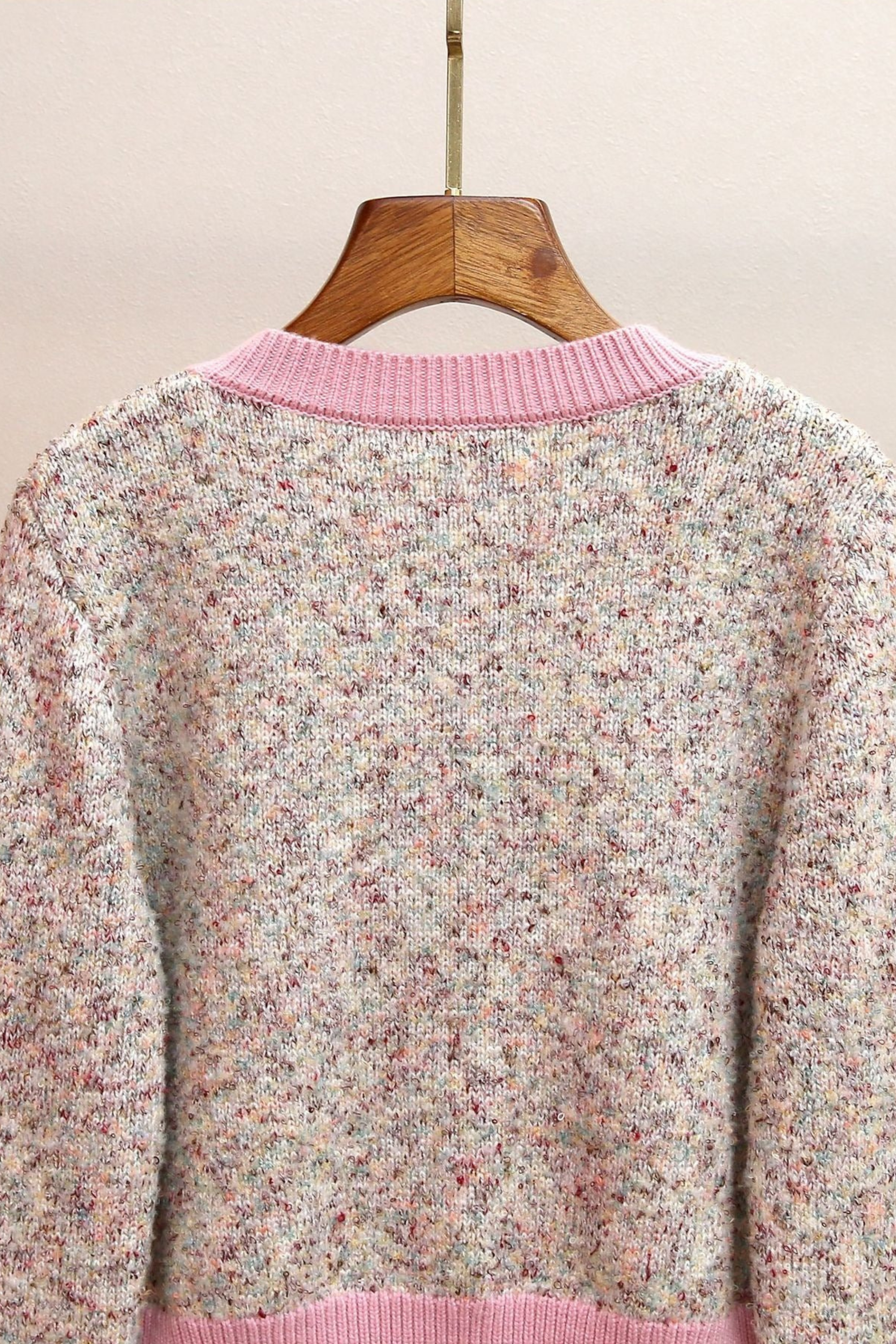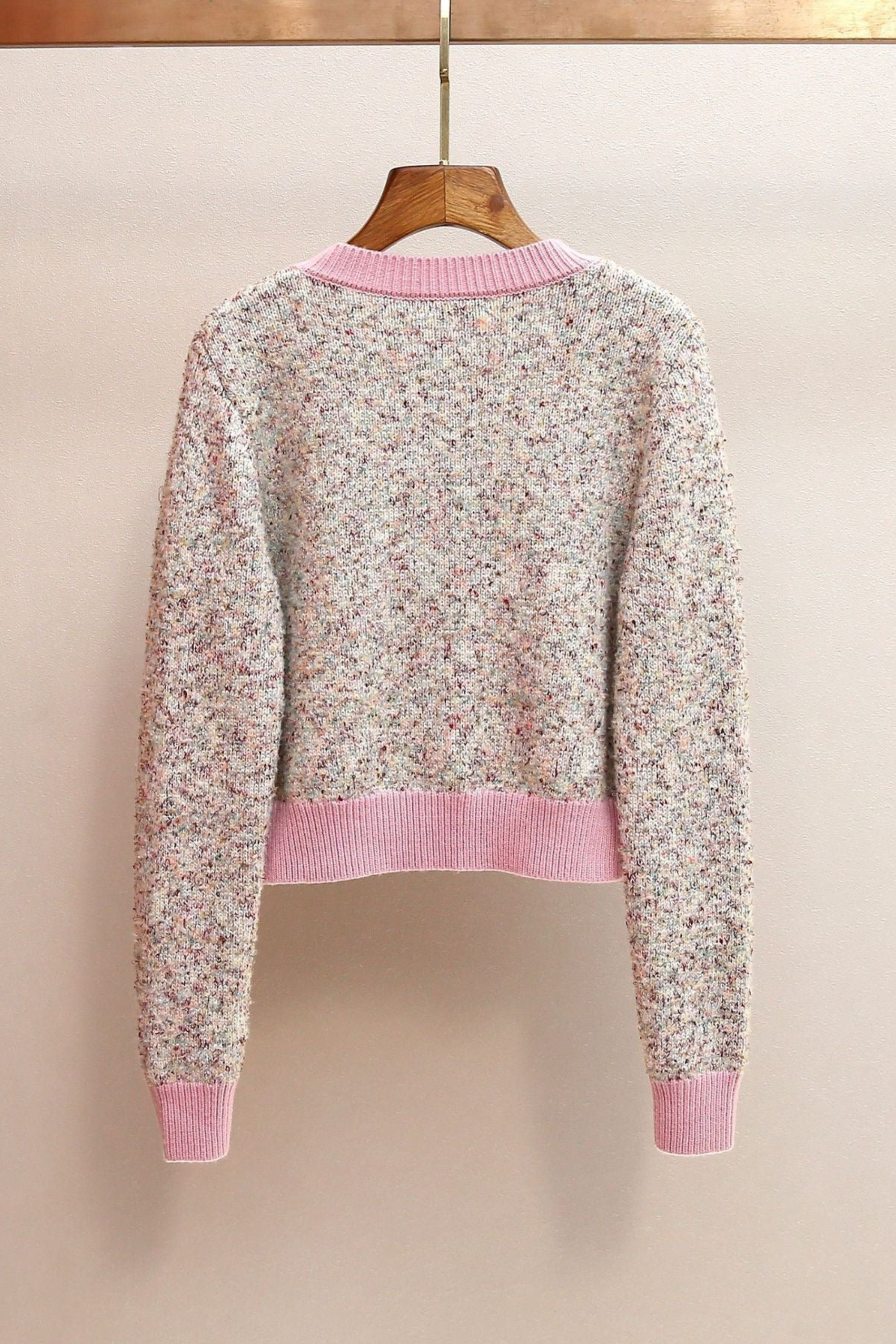 Chic and cozy, this tweed-inspired knit cardigan features contrast pink trimming and decorative buttons for a feminine, polished finish. Designed with two front pockets and a cropped fit, it pairs effortlessly with jeans or skirts for an elevated everyday look.