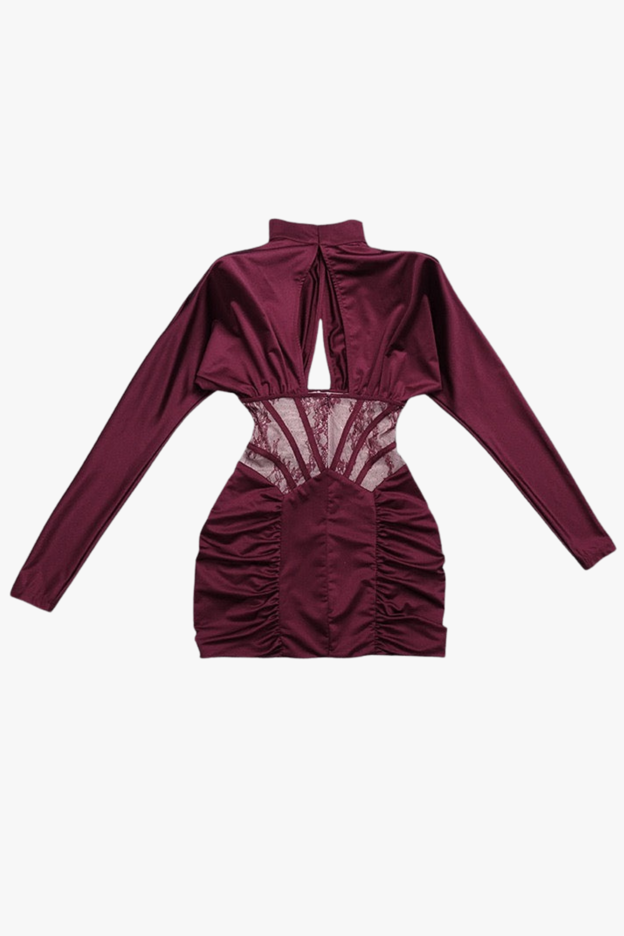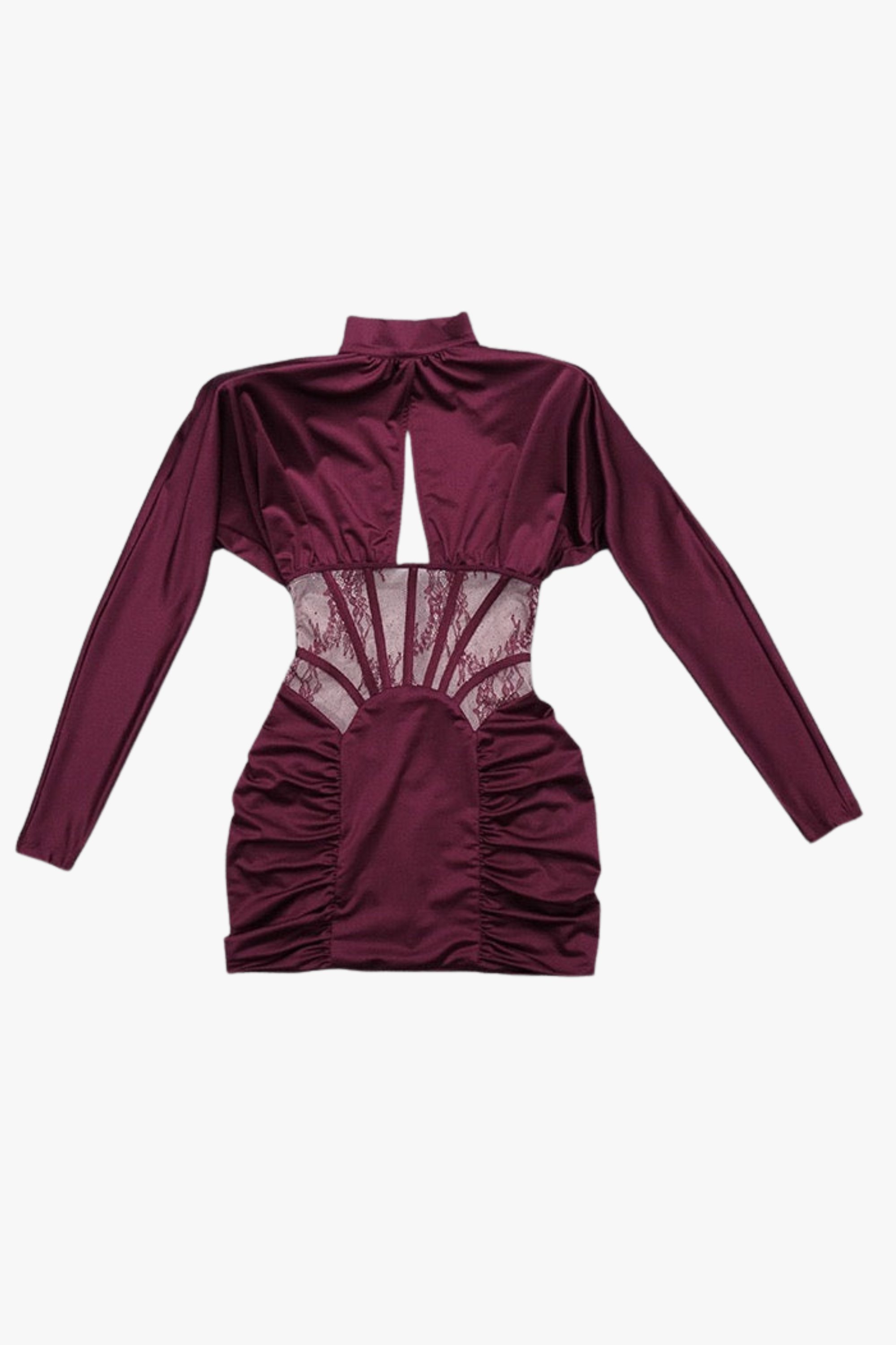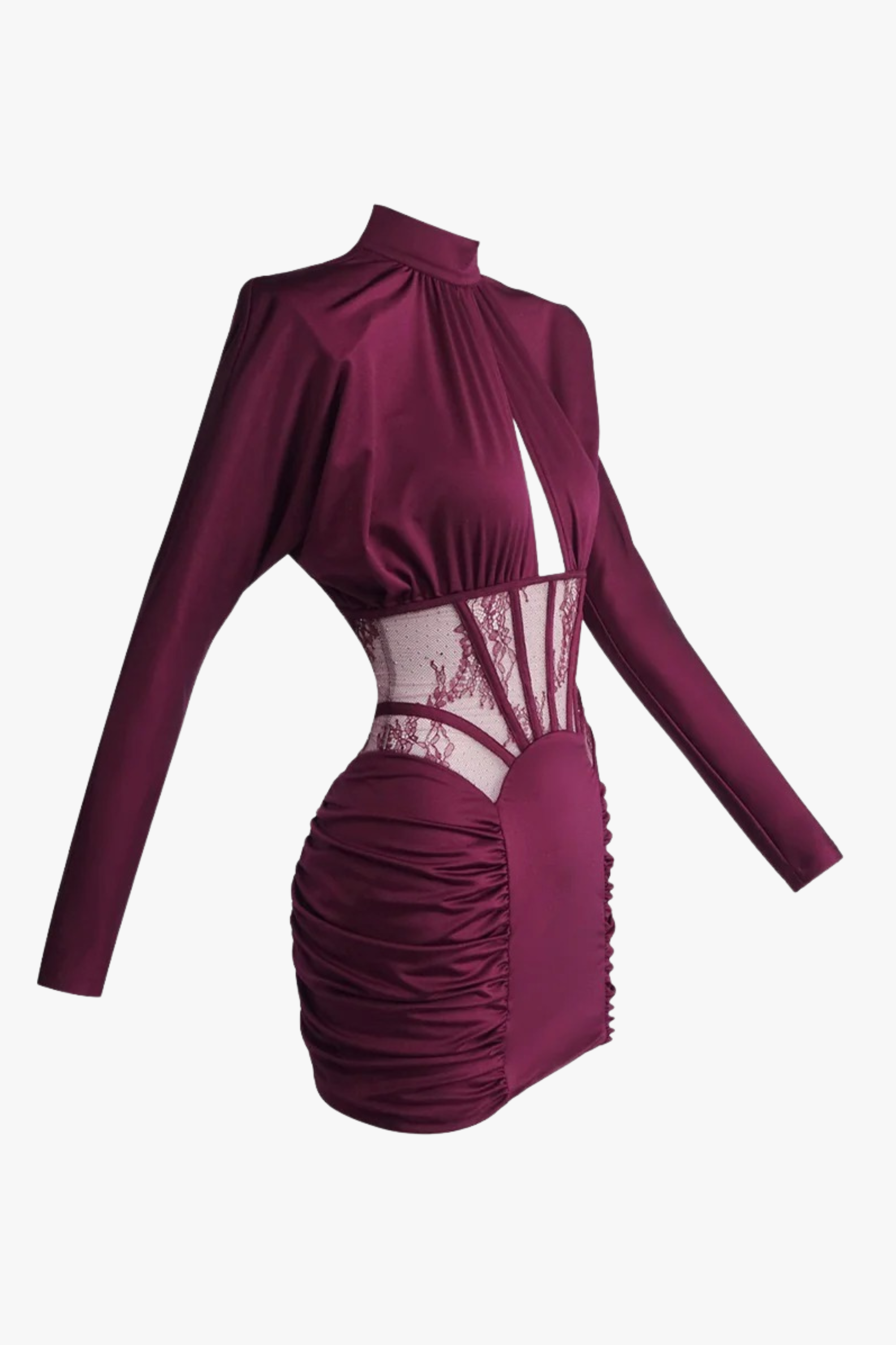 Elevate your evening look with this sculpting corset dress, designed with long sleeves and a refined high neckline. Featuring sheer lace detailing at the waist and a softly ruched skirt, this piece creates a flattering, figure-enhancing silhouette. Crafted from smooth satin-finish fabric for a luxe feel, it’s perfect for special occasions, dinners, and statement nights out.