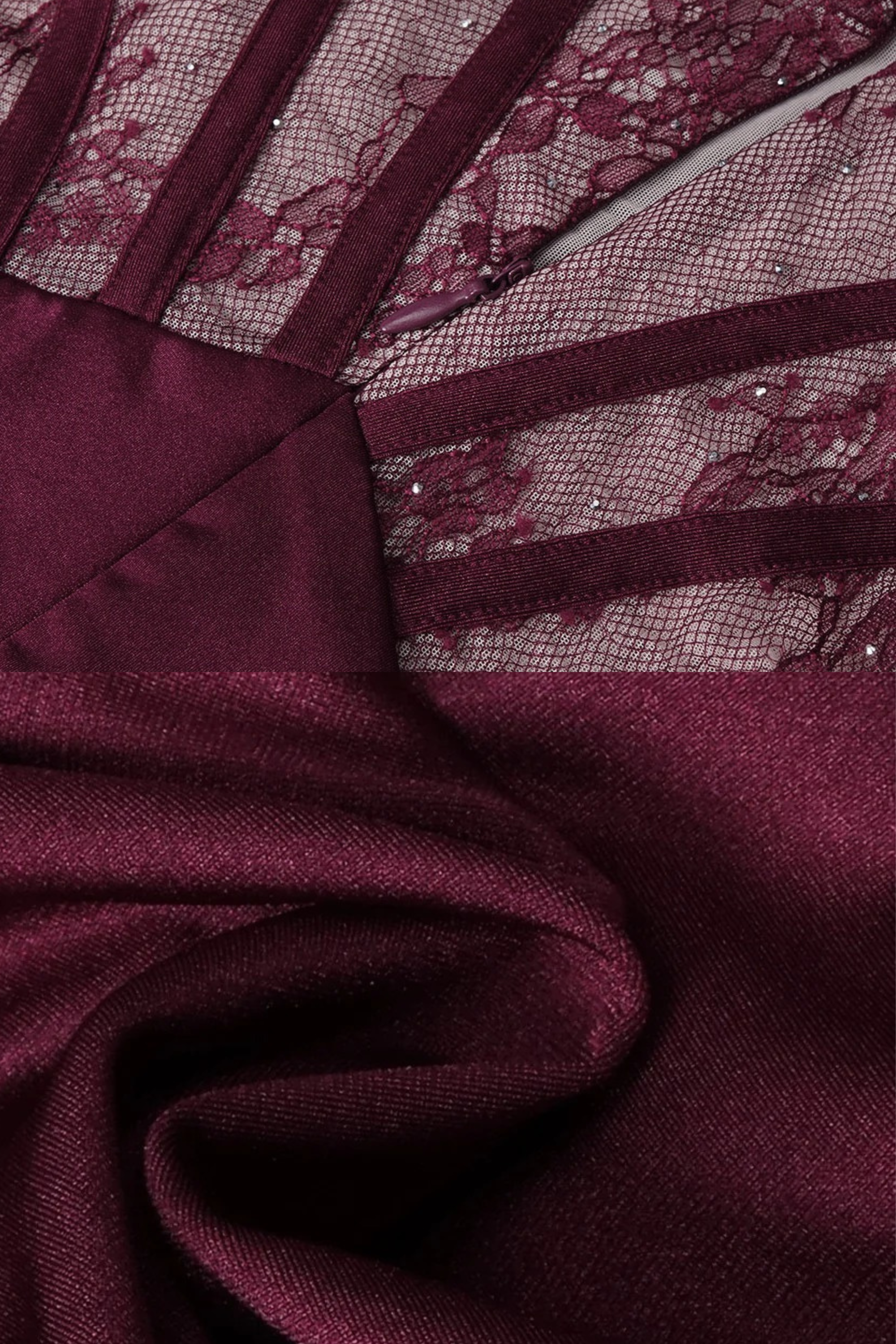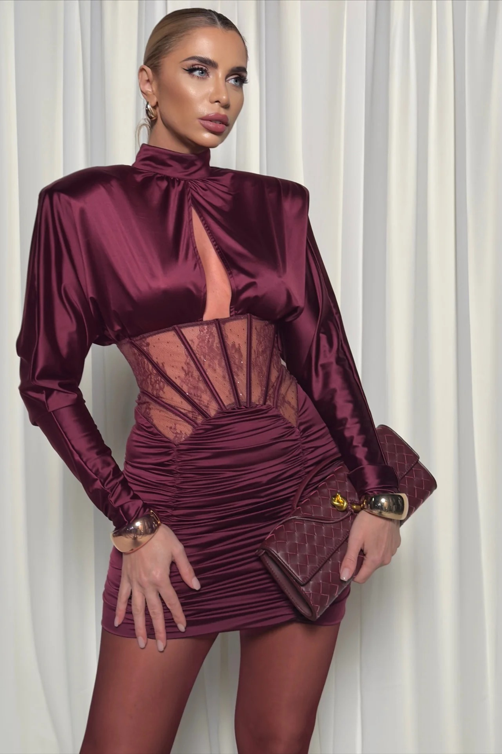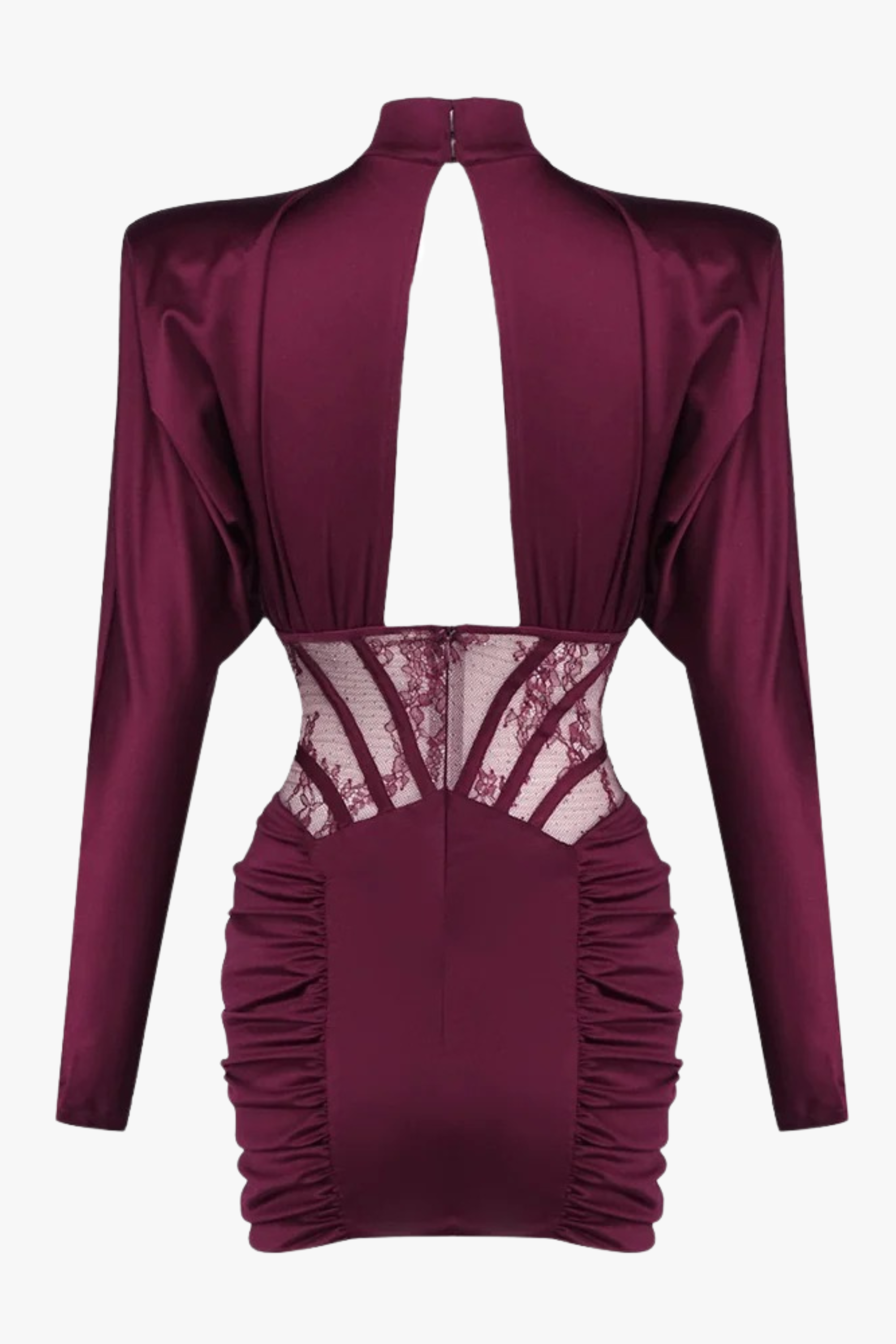 Elevate your evening look with this sculpting corset dress, designed with long sleeves and a refined high neckline. Featuring sheer lace detailing at the waist and a softly ruched skirt, this piece creates a flattering, figure-enhancing silhouette. Crafted from smooth satin-finish fabric for a luxe feel, it’s perfect for special occasions, dinners, and statement nights out.