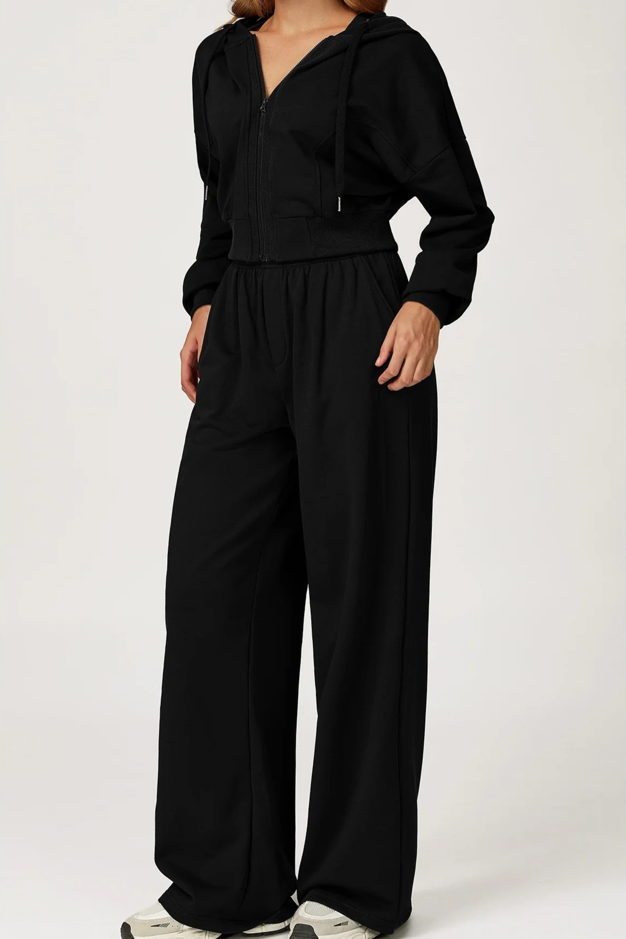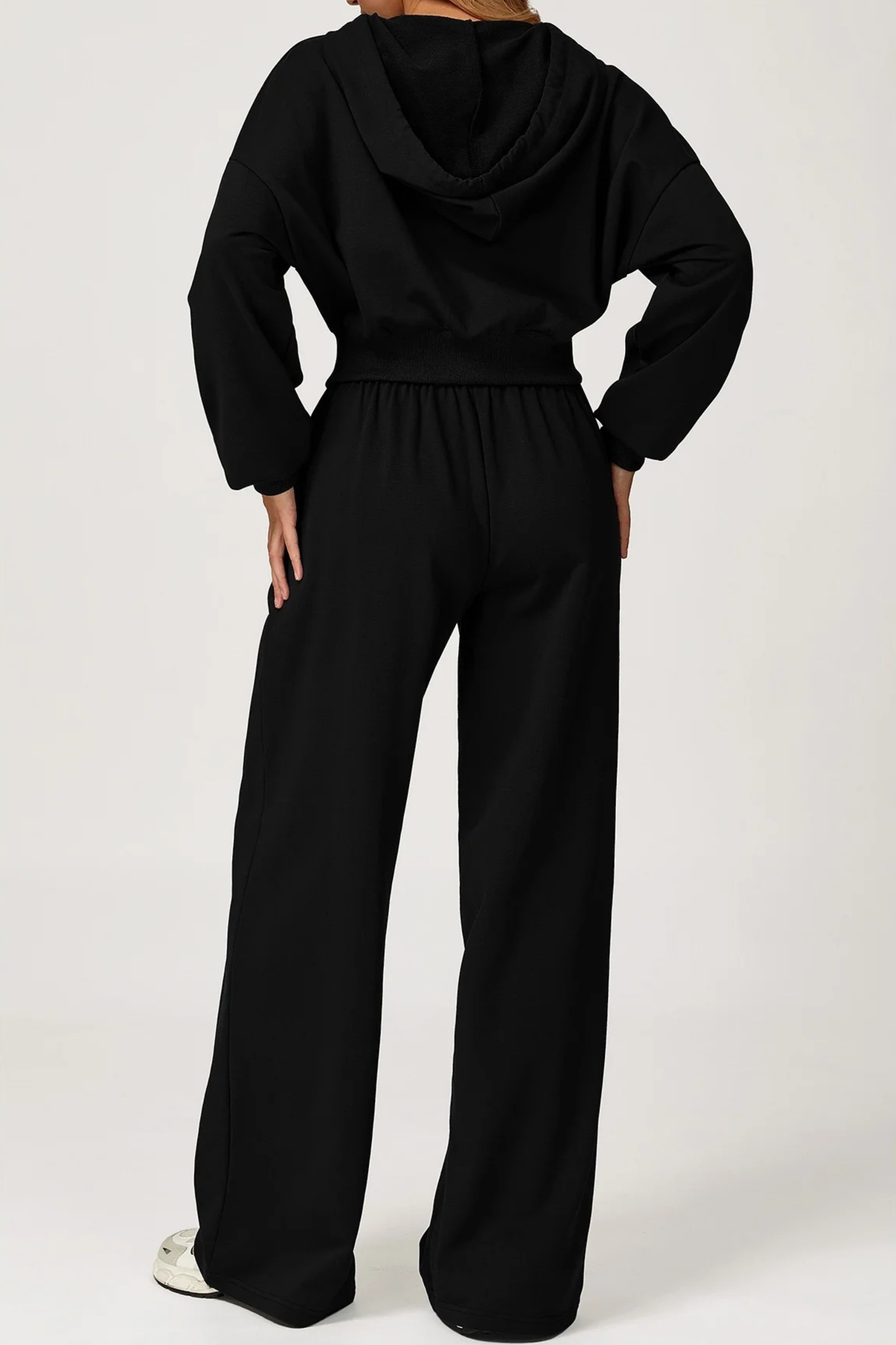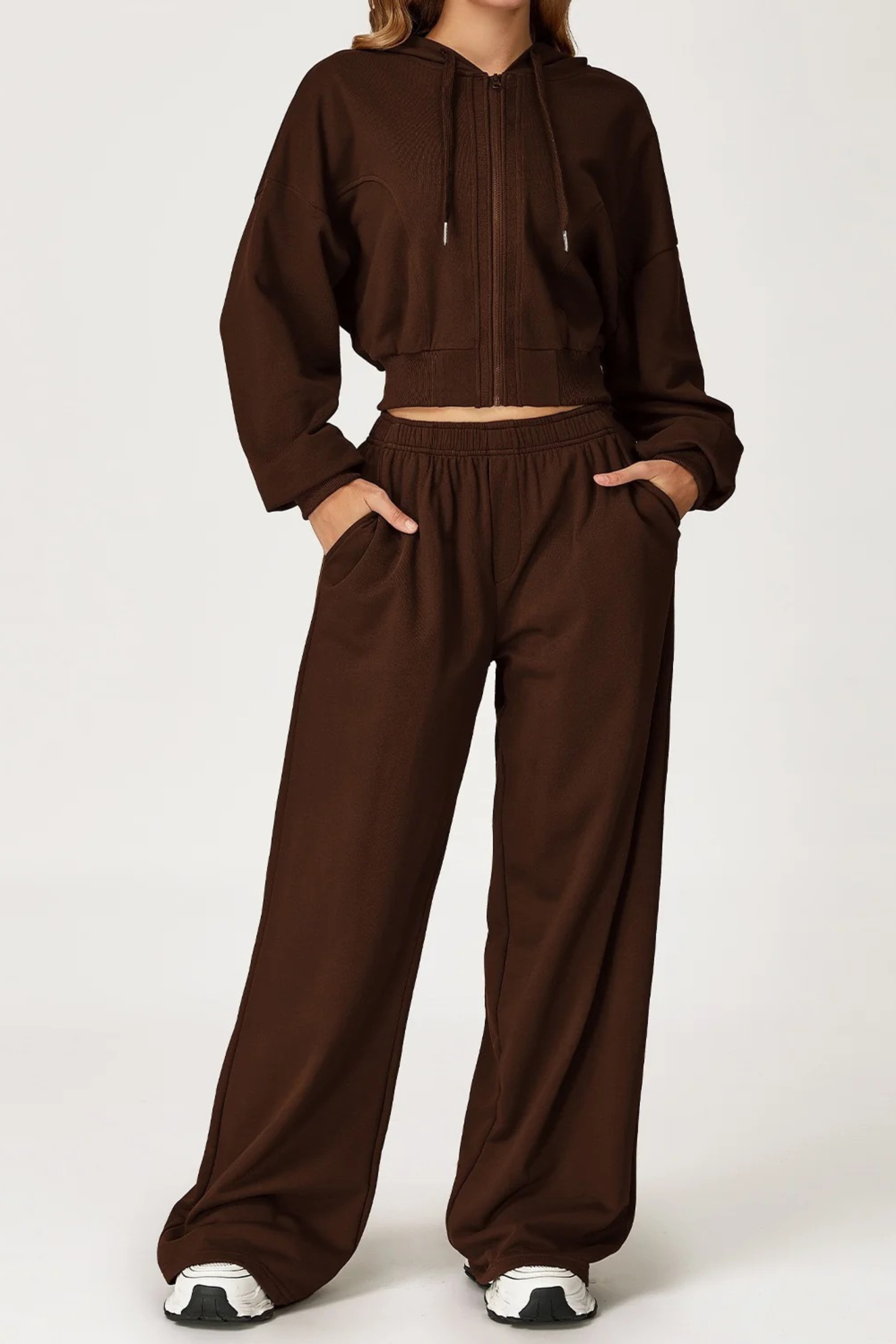 Elevate your casual wardrobe with this two-piece lounge set, featuring a cropped zip-up hoodie with drawstring detail and matching high-waist wide-leg sweatpants. Made from soft, breathable fabric, this set combines comfort and modern streetwear style—perfect for daily wear, travel, or relaxed weekends.