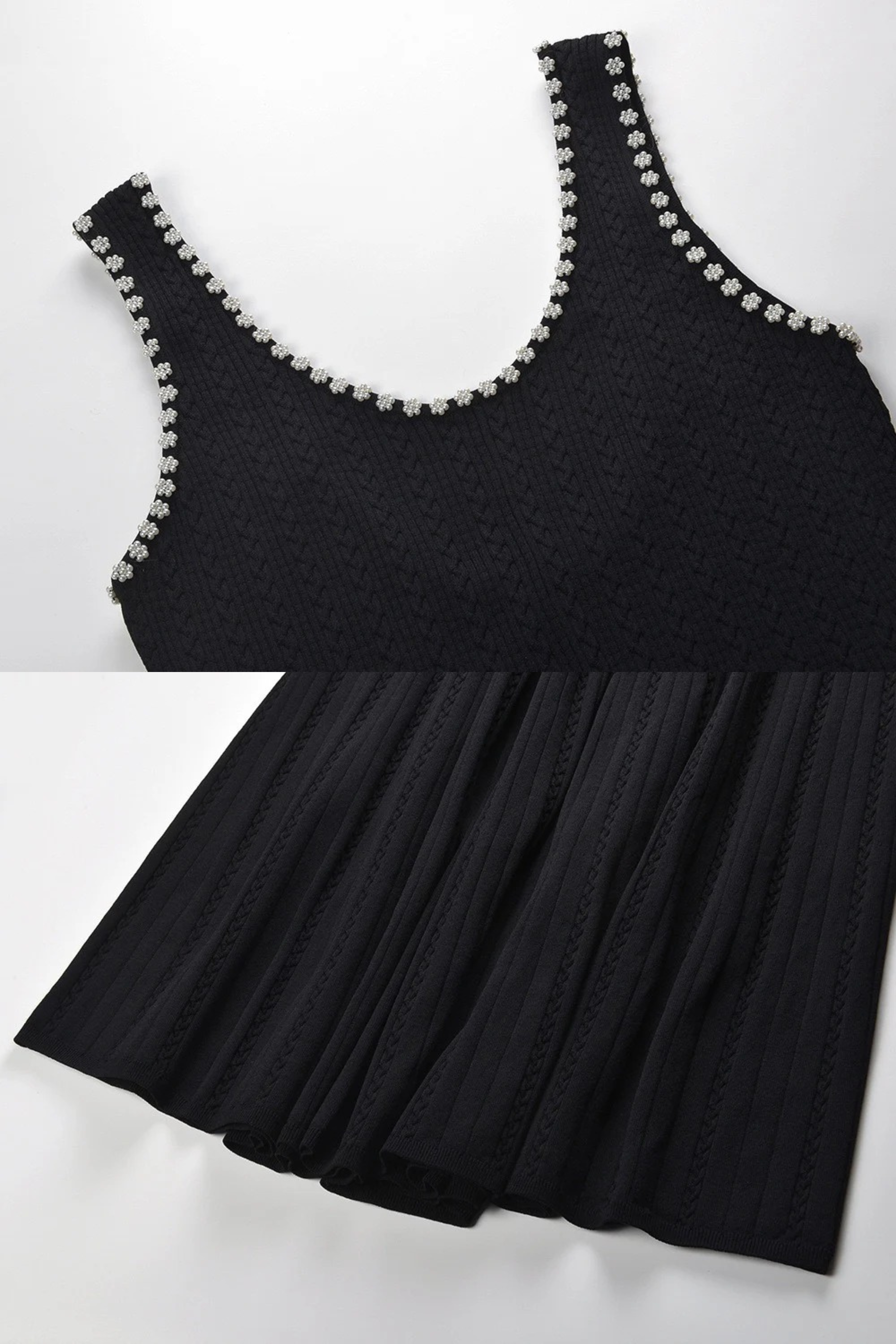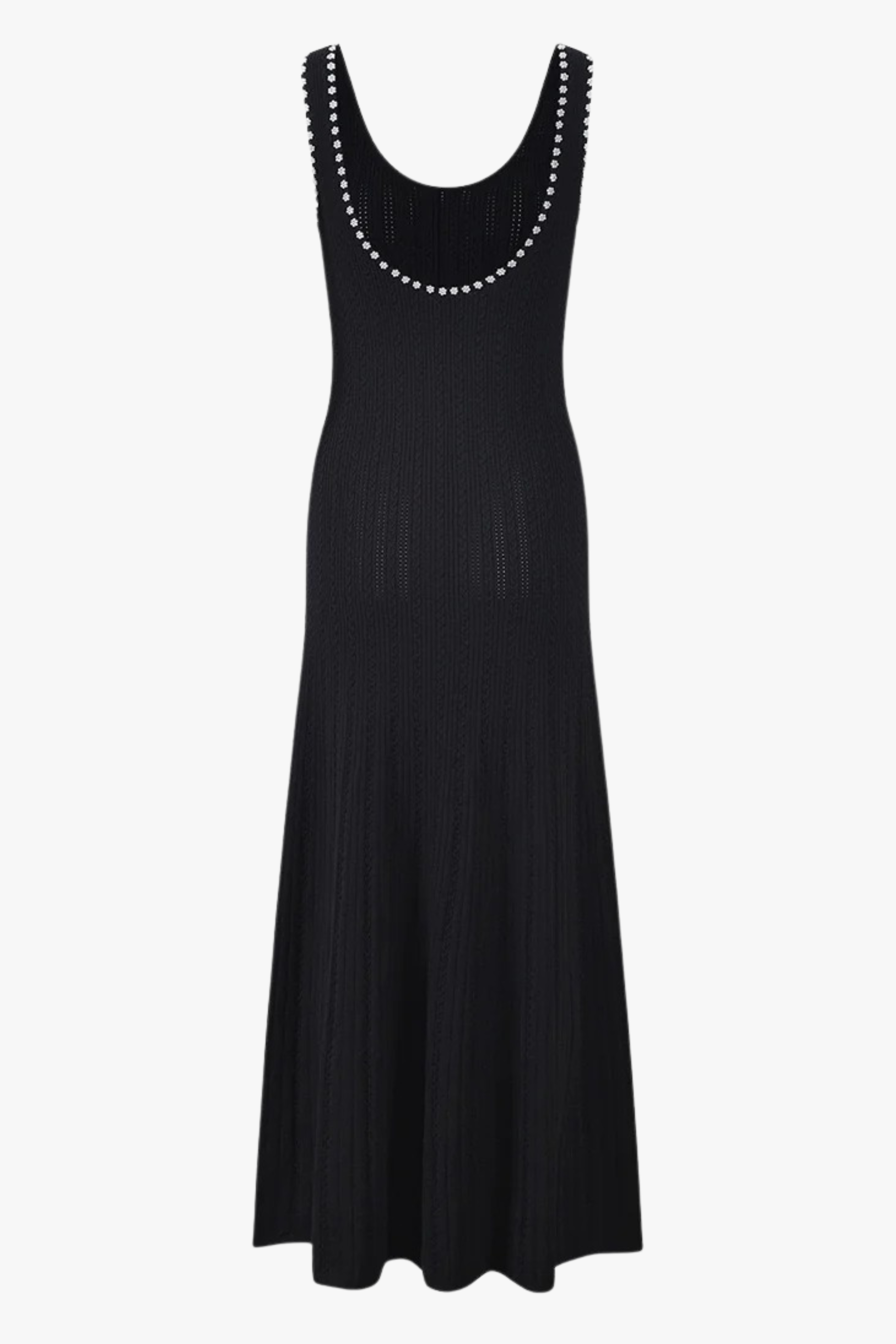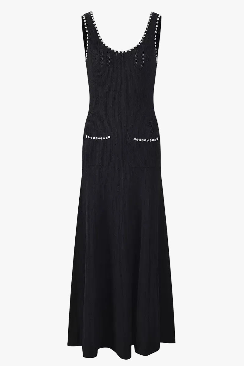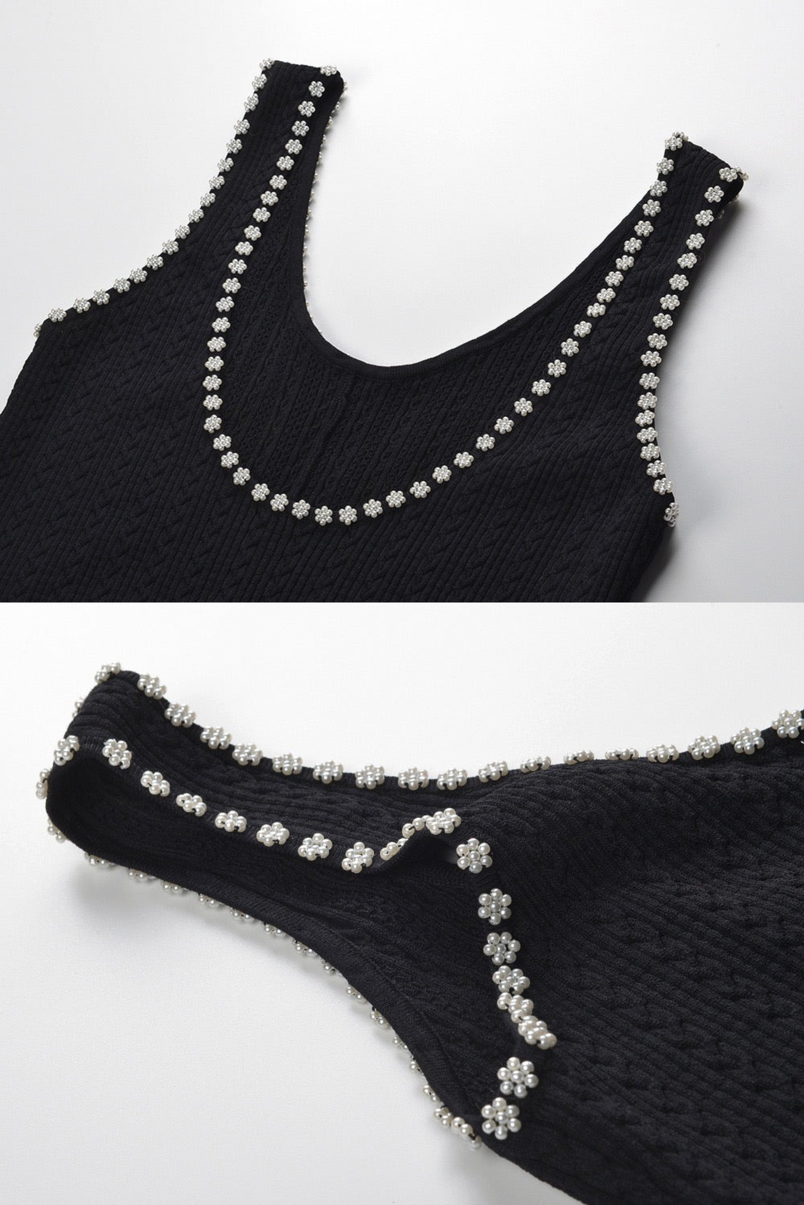 Pearl Trim Ribbed Knit Midi Dress with Sleeveless Cut and Flared Hem Design