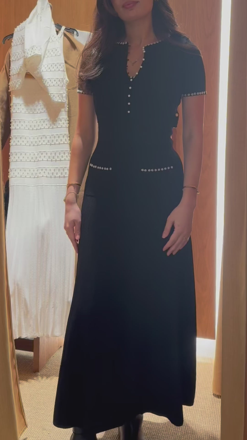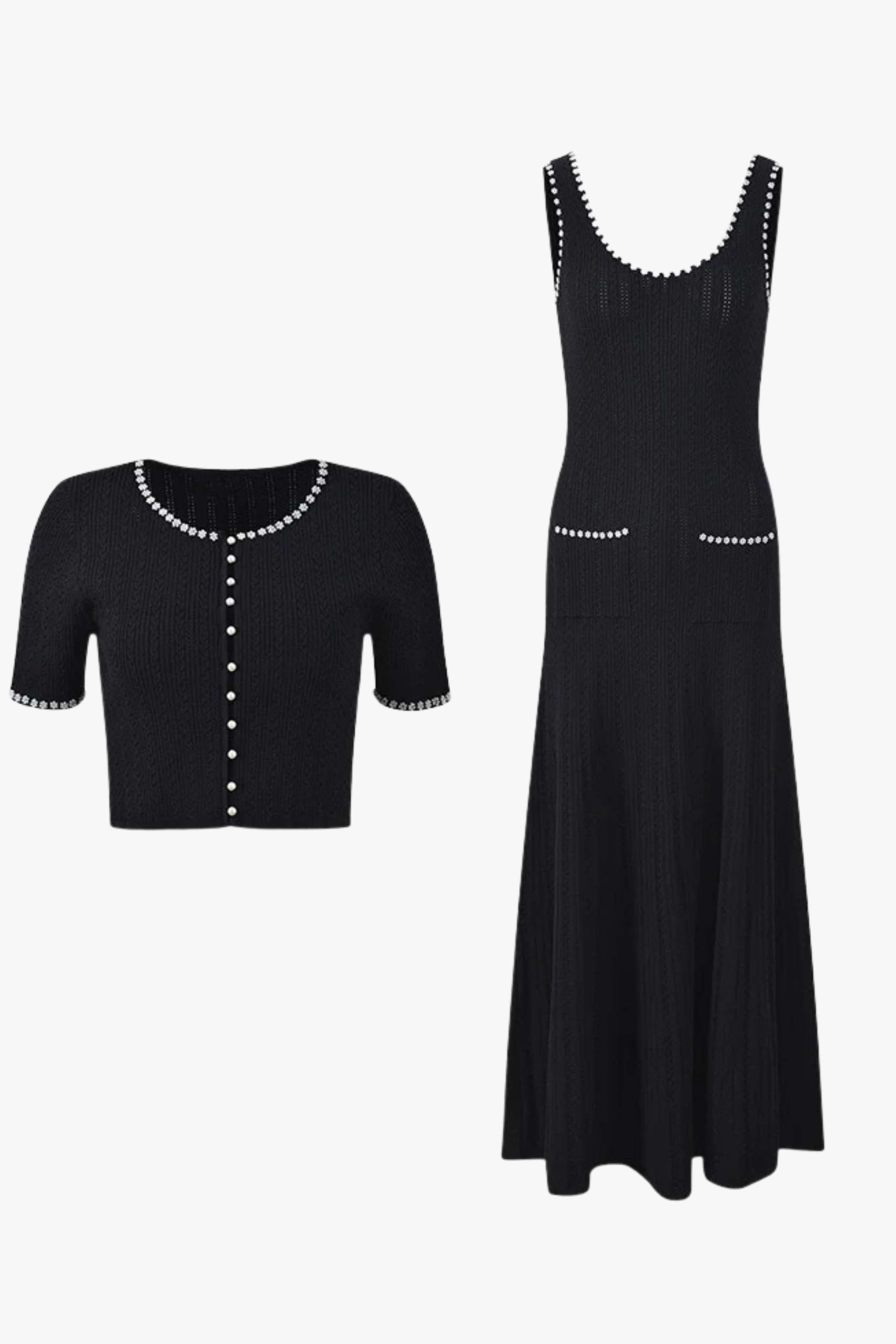 The contrast white pearl embellishments trace the neckline, straps, and subtle pocket accents, adding a feminine and elevated touch to the look. The fitted bodice flows into a gently flared hem, bringing movement and balance to the overall design.