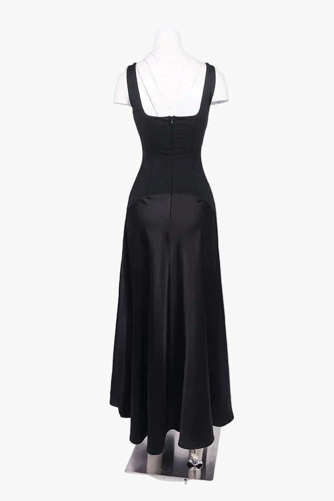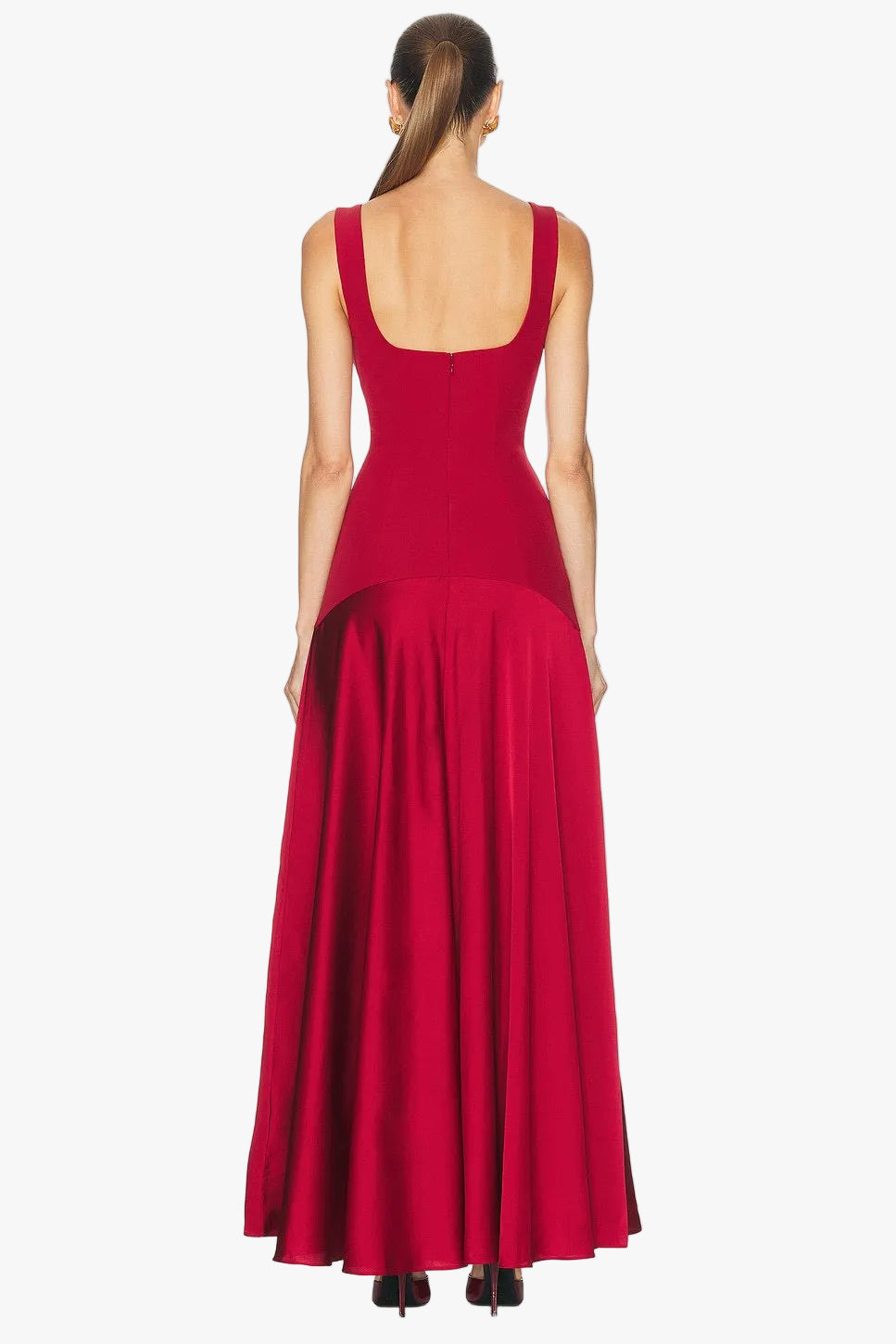 Designed with a sculpted silhouette, this maxi dress features a structured bodice with a square neckline that enhances the shape of the upper body. The fitted top flows into a smooth, flared skirt with a soft satin finish, creating elegant movement with every step.