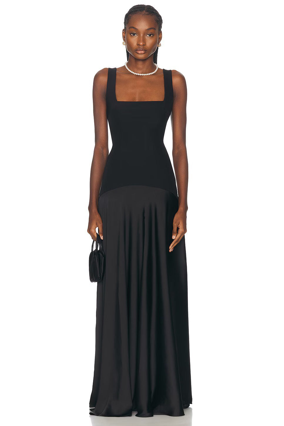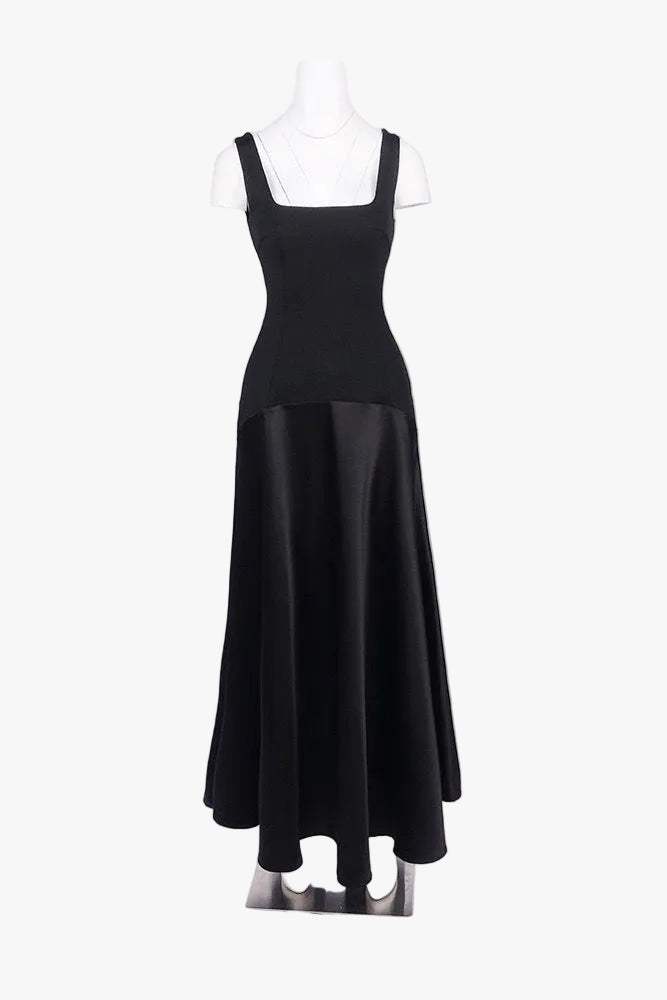 The contrast between the matte bodice and fluid skirt adds depth and a refined feel, making it perfect for formal events, evening occasions, and special nights out. The wide straps provide support while keeping the look clean and minimal.