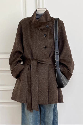 Belted Wool-Blend Coat with High Collar, Button Closure, and Relaxed Fit