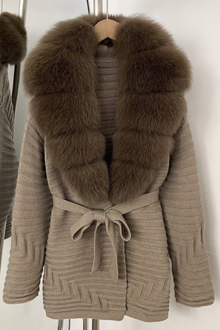 Belted Winter Coat with Faux Fur Collar – Long Sleeve Textured Fabric Jacket
