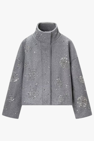 Embellished Wool Short Jacket – Grey High Neck Coat with Crystal Beads & Sequins
