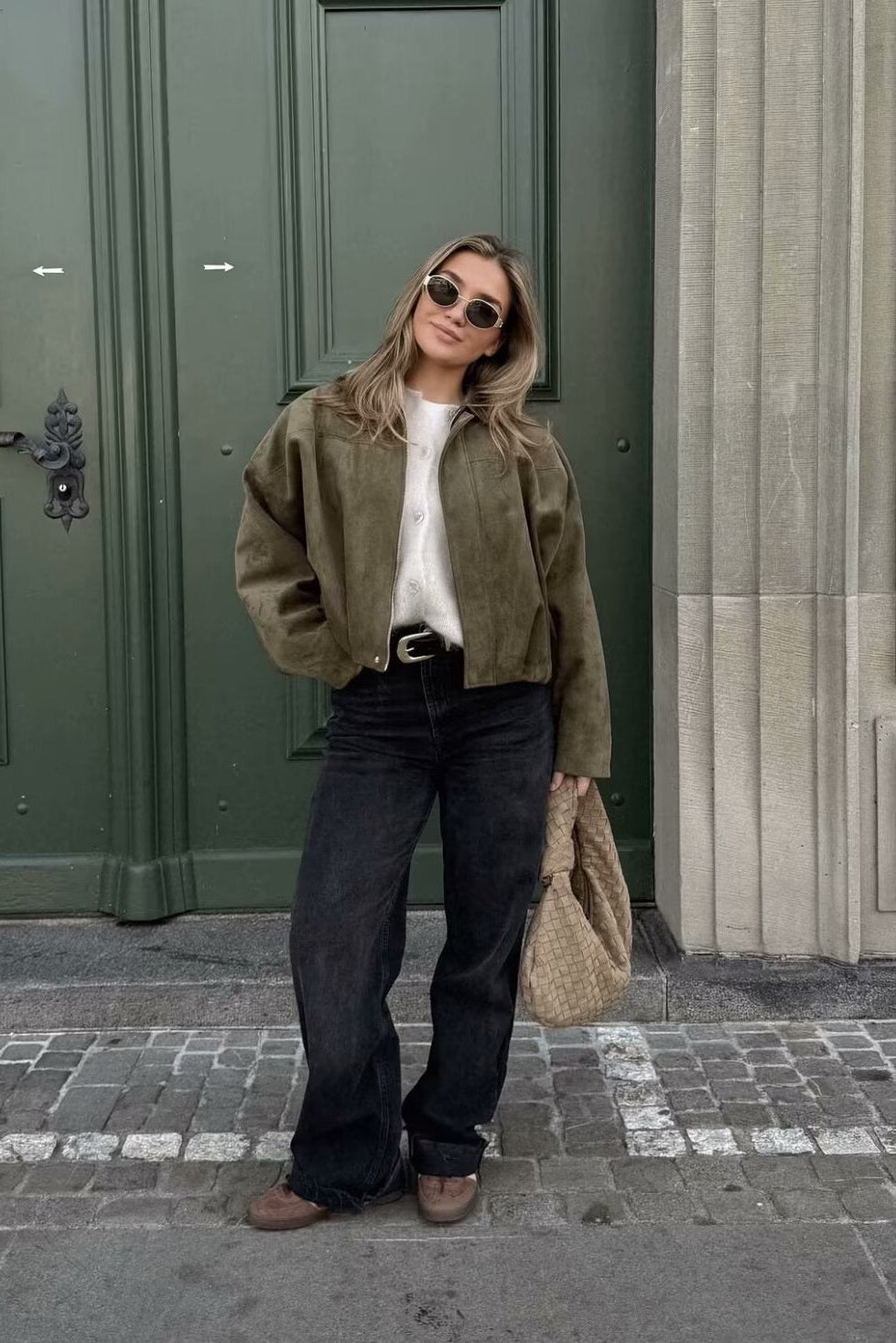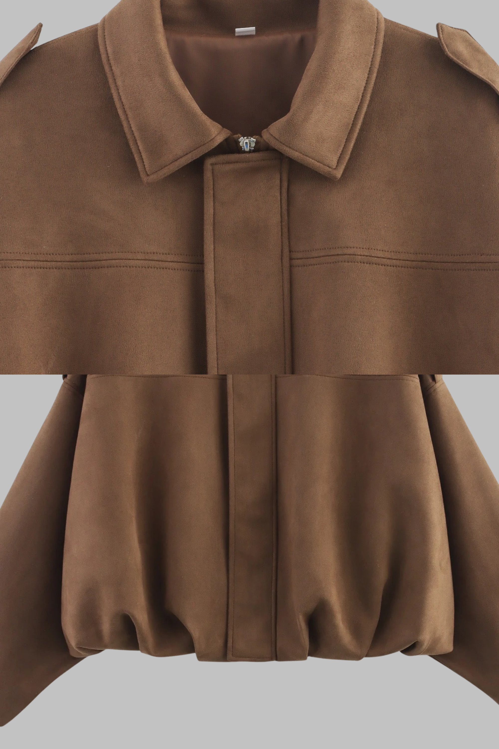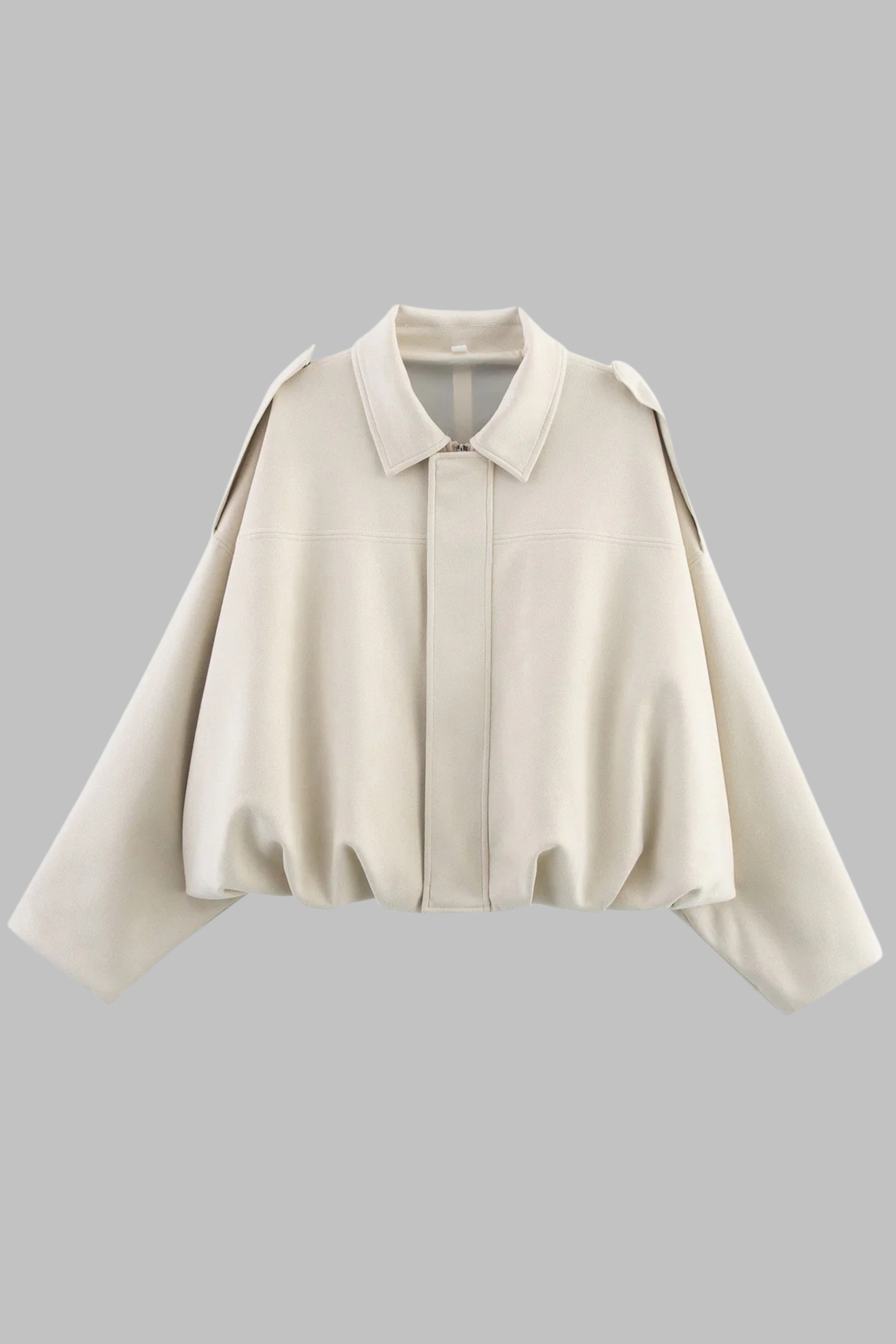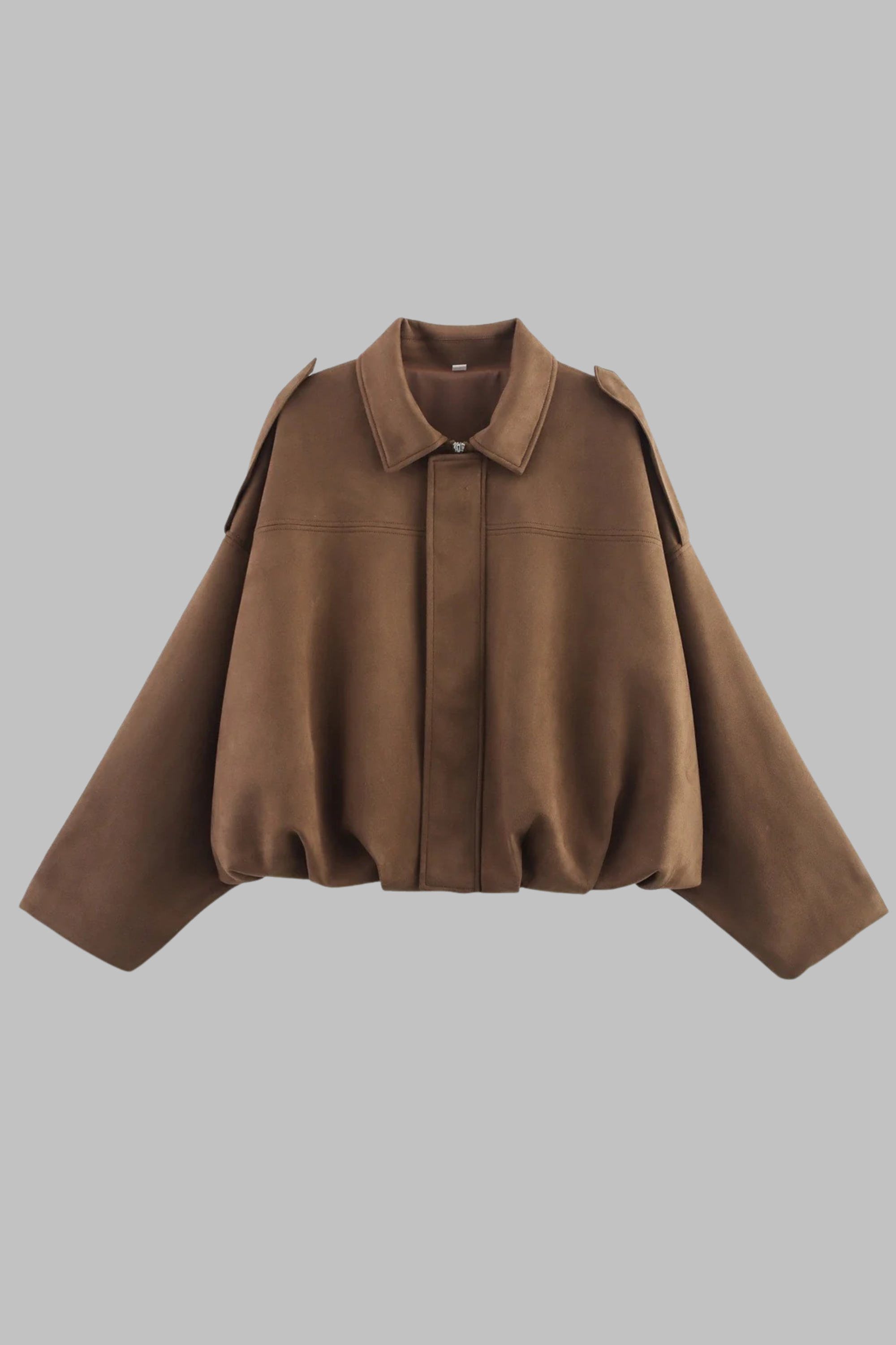 This oversized faux suede jacket blends modern minimalism with a touch of utilitarian style. Crafted from soft, velvety suede-effect fabric, it features a collared neckline, concealed front closure, and statement shoulder flaps for a structured finish. The relaxed silhouette is enhanced with dropped shoulders and a gathered elastic hem that adds volume and shape while ensuring a comfortable fit. Perfect for layering over knits, denim, or tailored trousers, it’s a versatile piece for both casual and city-chic looks.