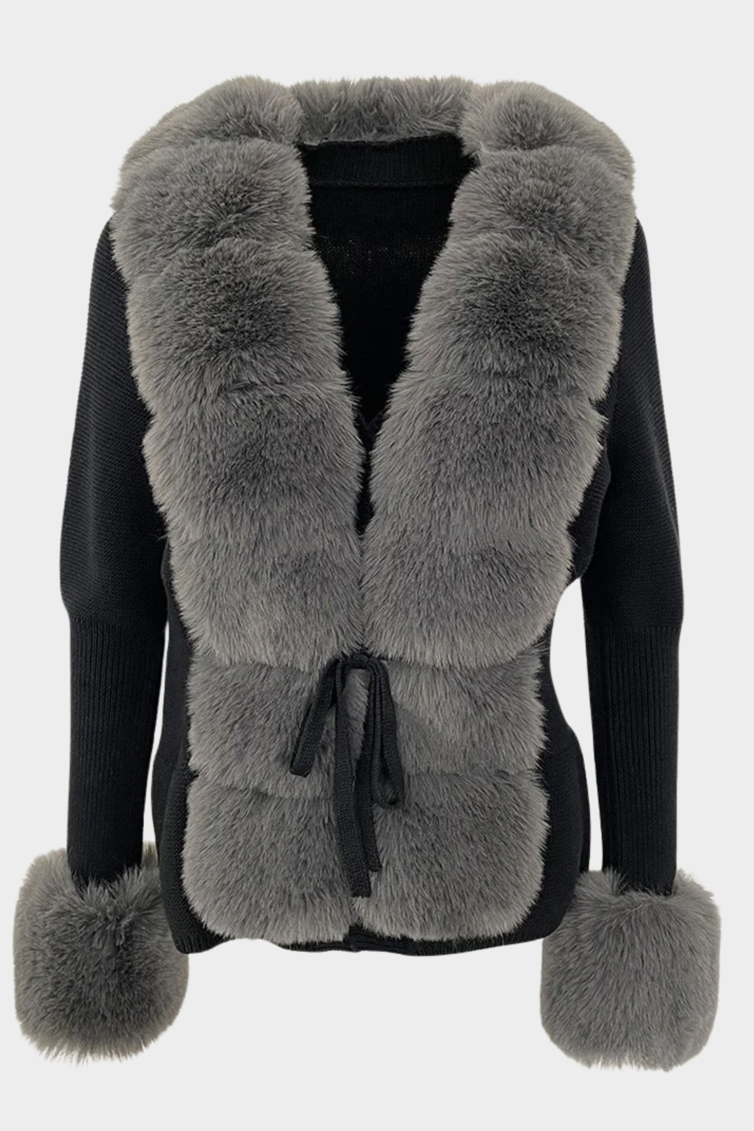 A chic cold-season essential combining soft knit fabric with plush faux fur detailing for a luxurious finish. This long sleeve jacket features voluminous faux fur panels along the front, collar, and sleeve cuffs, creating a rich contrast against the knitted body.