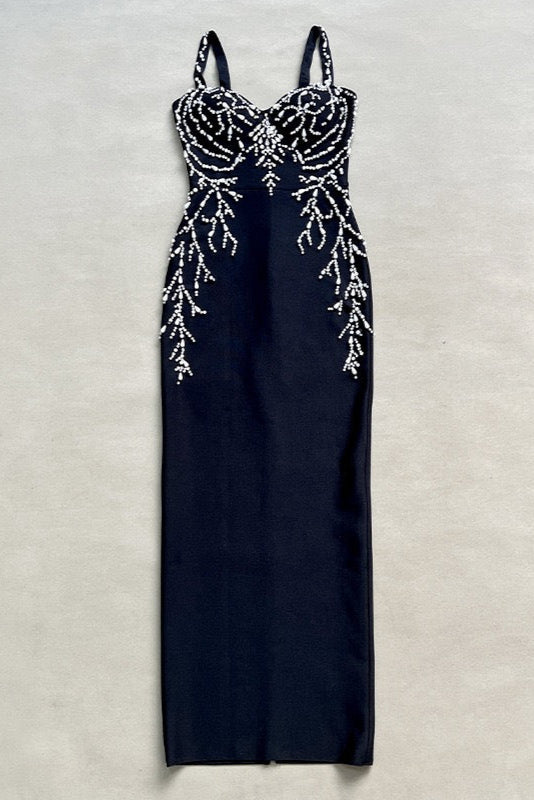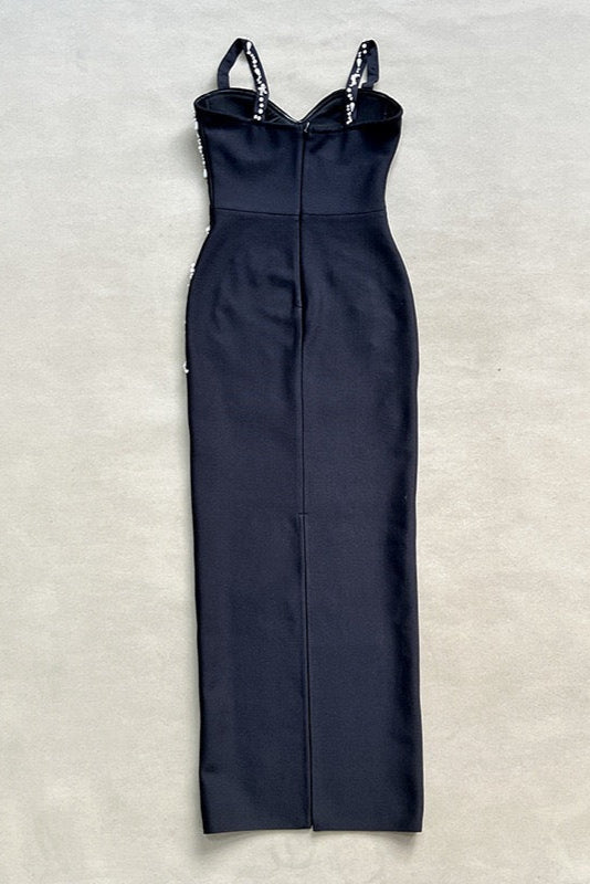 Black Rhinestone Embellished Bandage Bodycon Long Dress – Sleeveless Strappy Slim Fit Party Dress