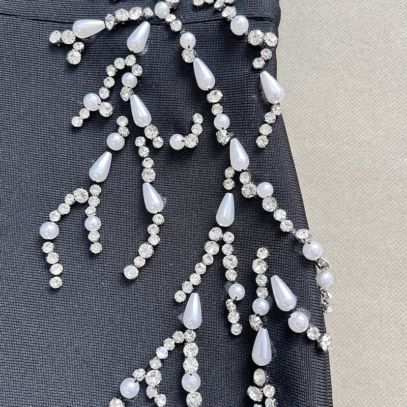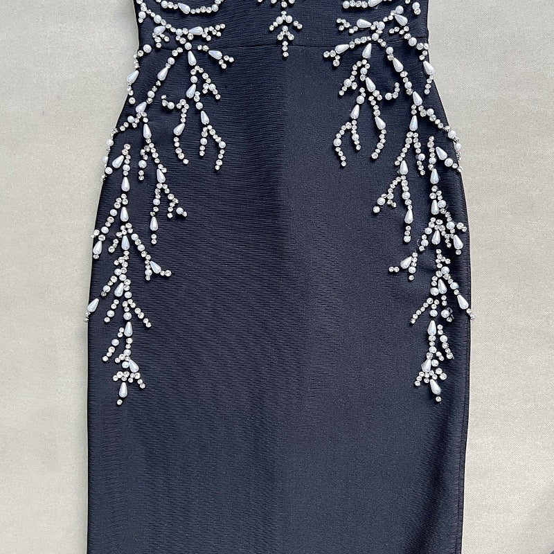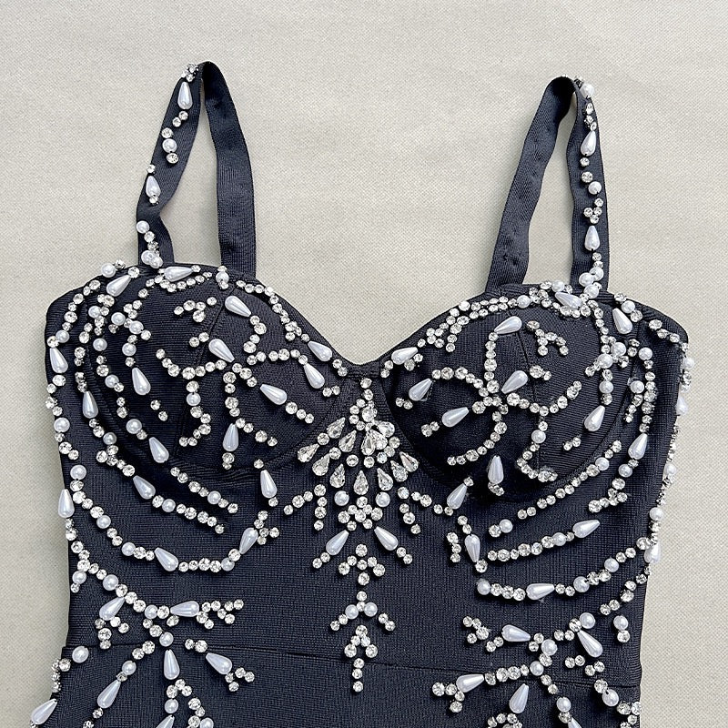 Turn heads at any event with this glamorous black midi dress, designed with shimmering rhinestone embellishments that highlight the bust and waist for a sculpted hourglass look. The sleeveless strappy design adds a sultry touch, while the slim bodycon fit hugs the curves with sophistication. Featuring a chic backless cut and a back slit for ease of movement, this dress is the perfect choice for cocktail parties, evening events, and red-carpet occasions.