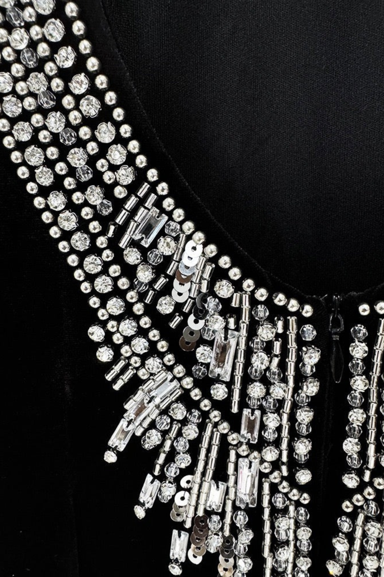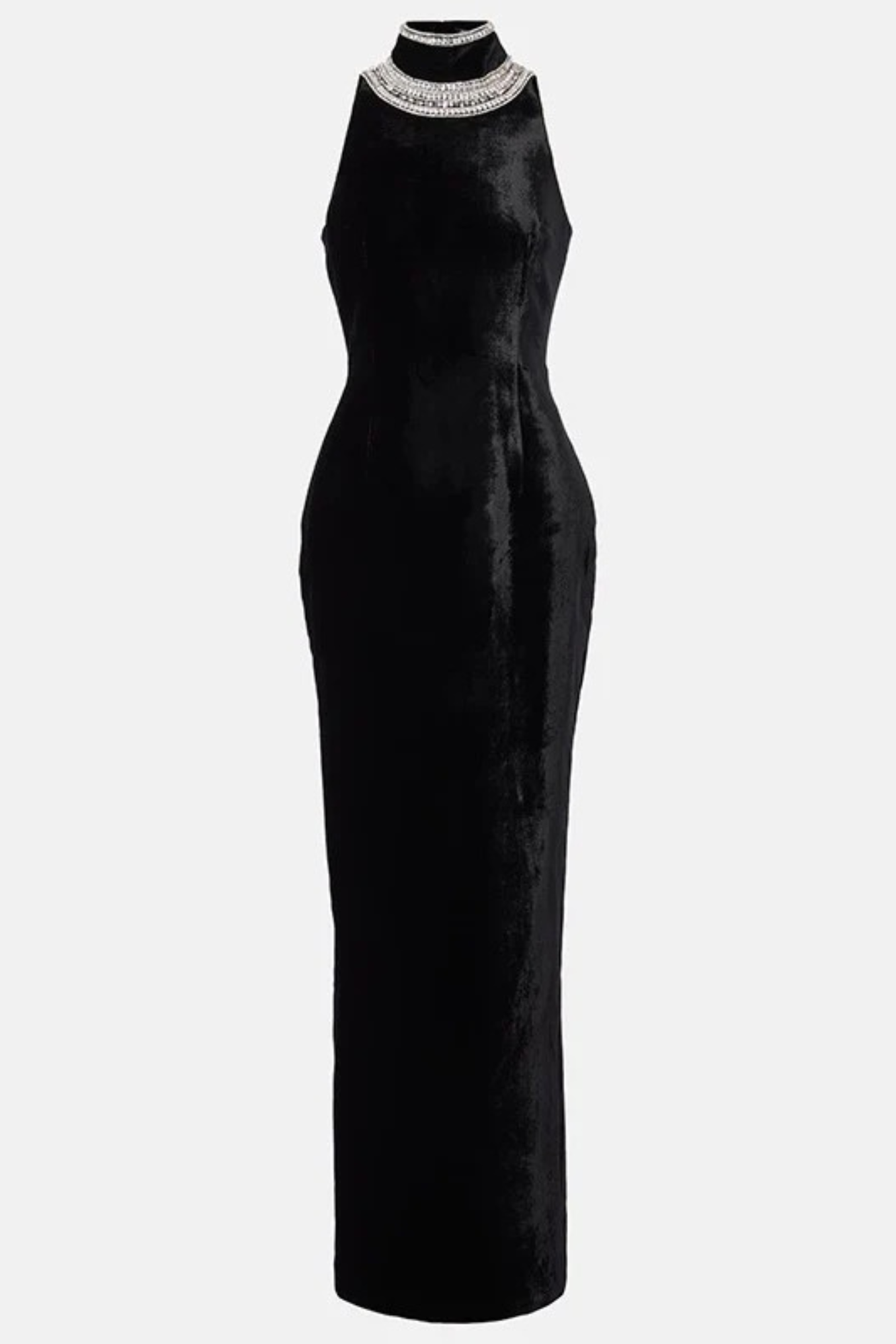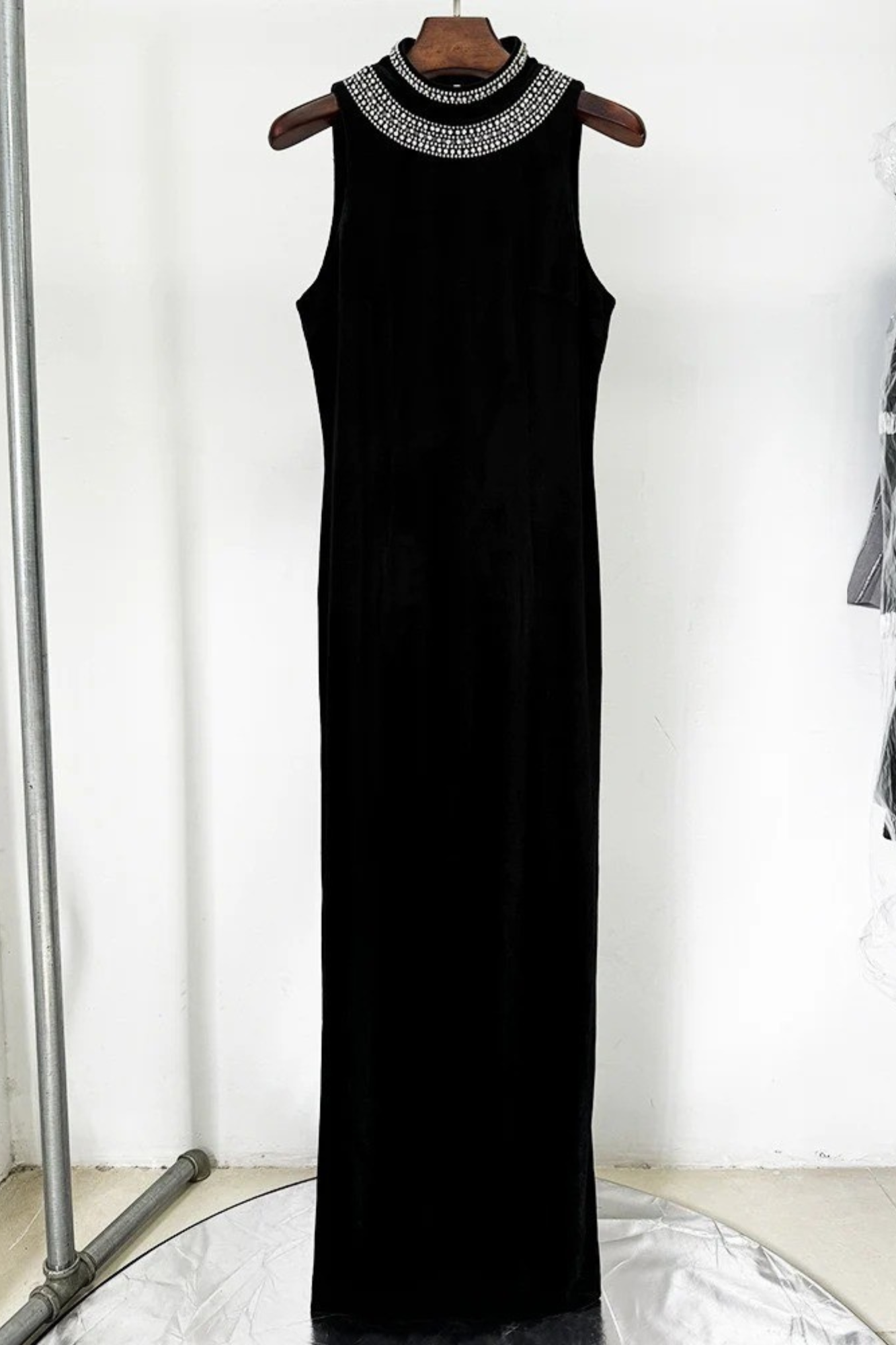 Velvet Sleeveless Long Dress with Rhinestone Embellished High Neck and Open Back