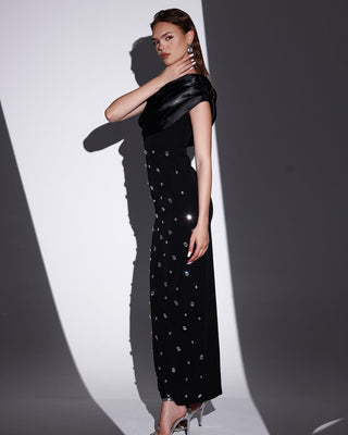 Hot Diamond Sparkle Bodycon Long Dress with Sculpted Pleats and Backless Cut