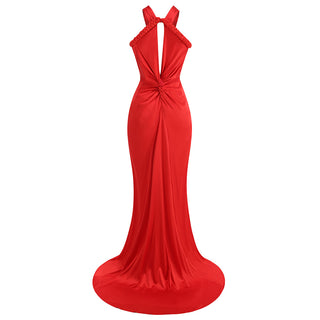 Chocolate Brown Halter Neck Long Dress – Sculpted Bodycon Gown with Braided Trim