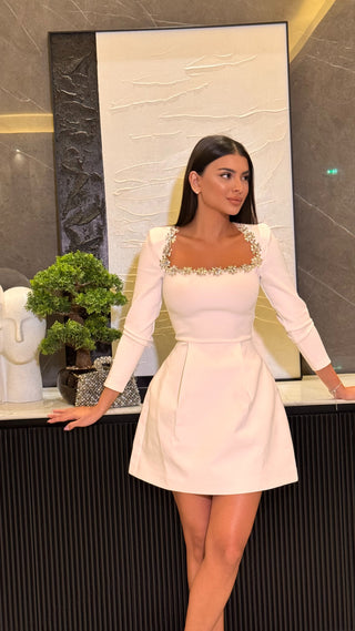 Long Sleeve Tweed Mini Dress with Pearl-Trimmed Square Neck and Pocket Details