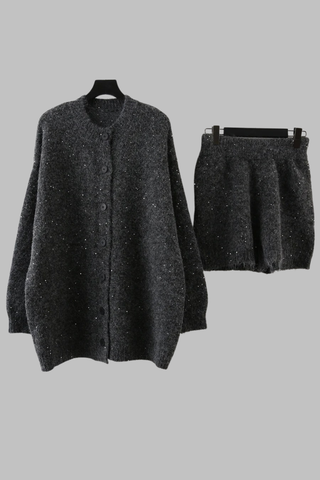 Shimmer Knit Mid-Long Dress with Three-Quarter Sleeves and Front Buttons