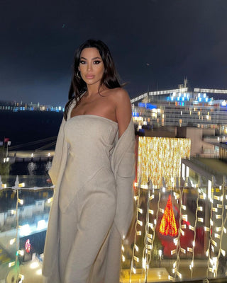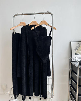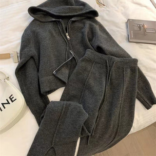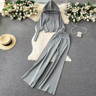 Comfy Hooded Knitted Set: Zip-Up Sweater & High-Waist Split Wide Leg Pants