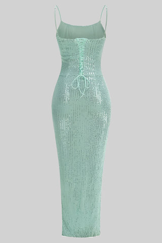 Mint Sequin Bodycon Long Dress with Spaghetti Straps and Thigh-High Slit