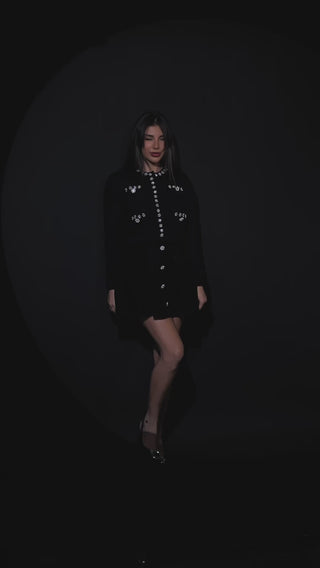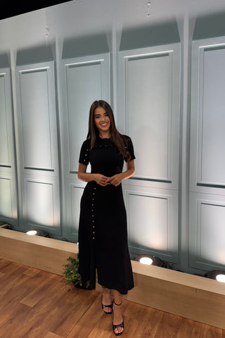 Long Sleeve Textured Knit Long Dress with Button Front & Rhinestone Embellishments