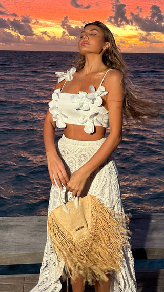 Charcoal Gray Three-Piece Knitted Set with White Floral Trim – Cardigan, Top & Pleated Mini Skirt