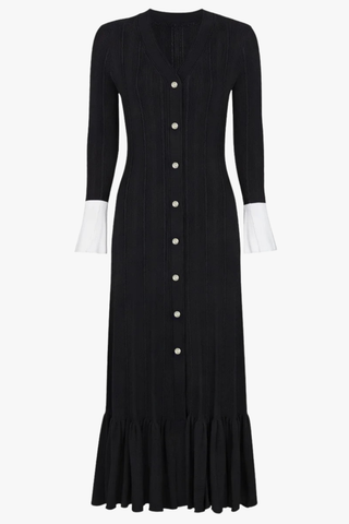 Ribbed Knit Mid-Long Dress with Contrast Pleated Cuffs and Button Front