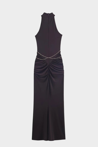 Elegant High Neck Cut-Out Long Dress with Draped Waist & Chain Accents