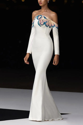 Off-Shoulder Long Sleeve Crepe Long Dress with Hand-Beaded Floral Embellishment