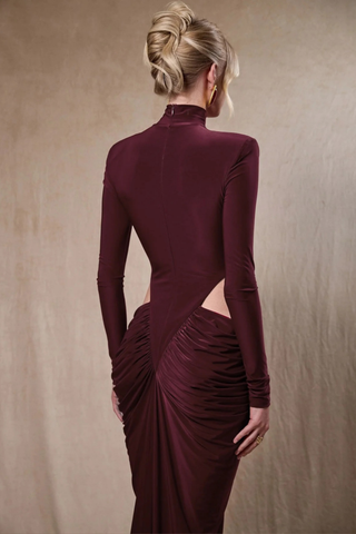 Long Sleeve High-Neck Stretch Long Dress – Side Cut-Out Ruched Design