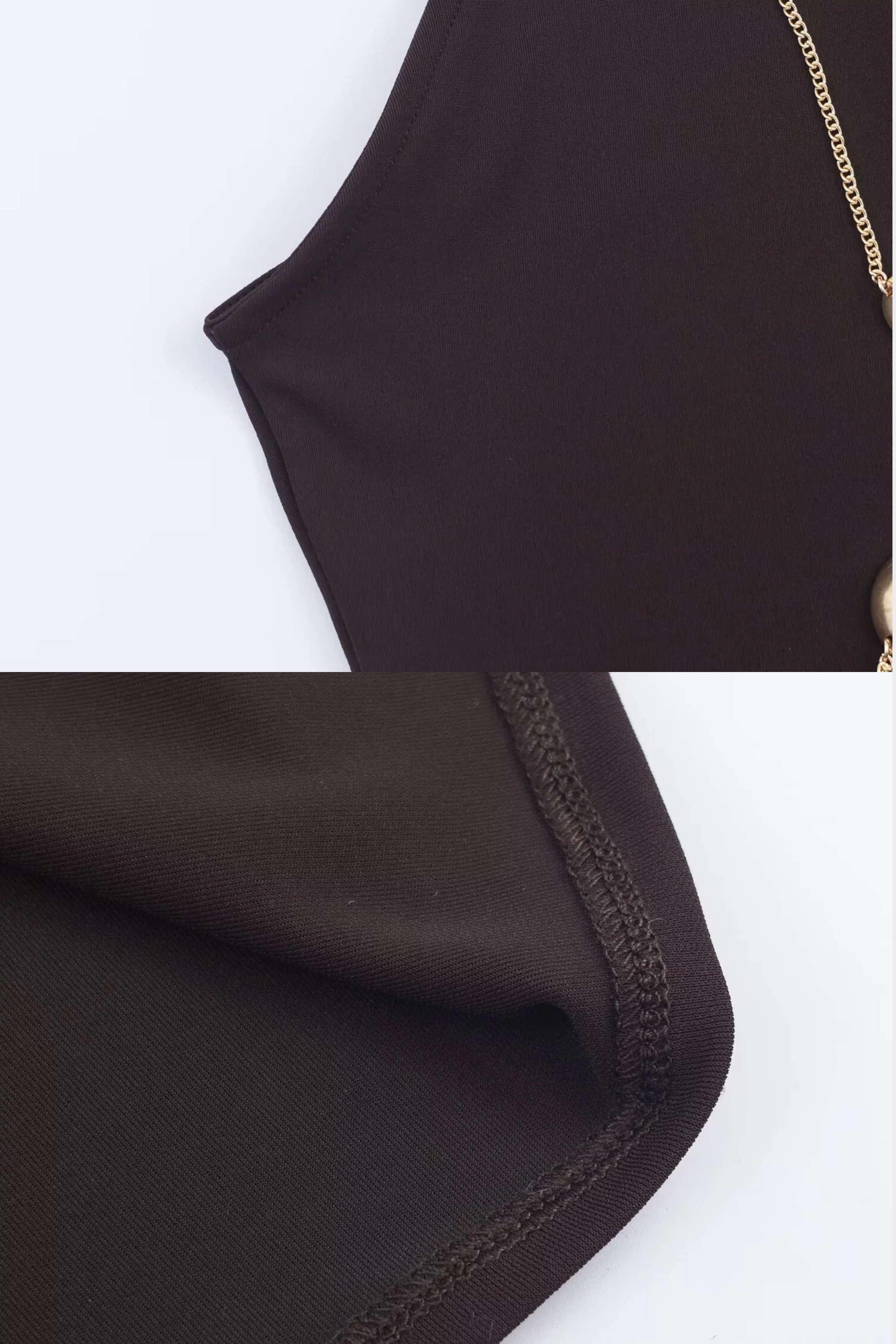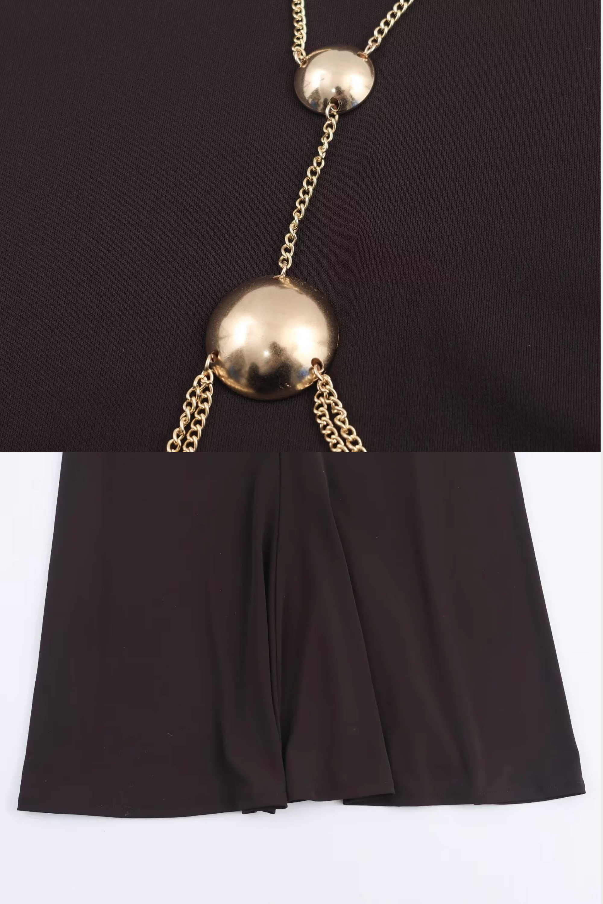 Elegant High Neck Cut-Out Long Dress with Draped Waist & Chain Accents