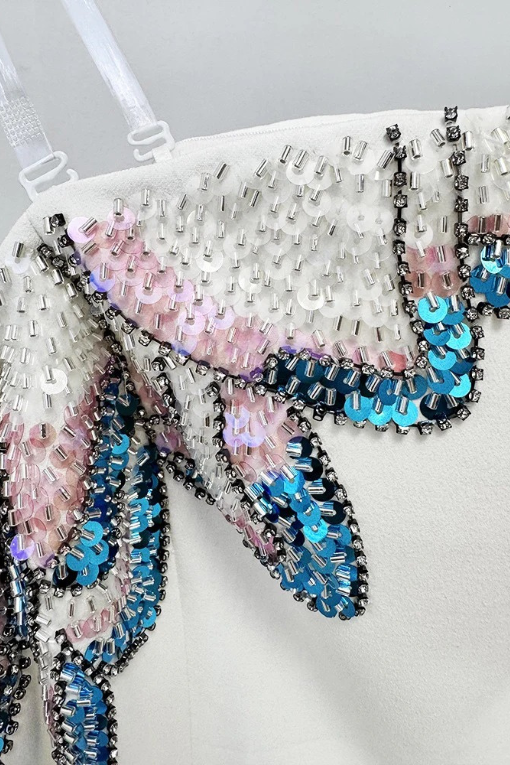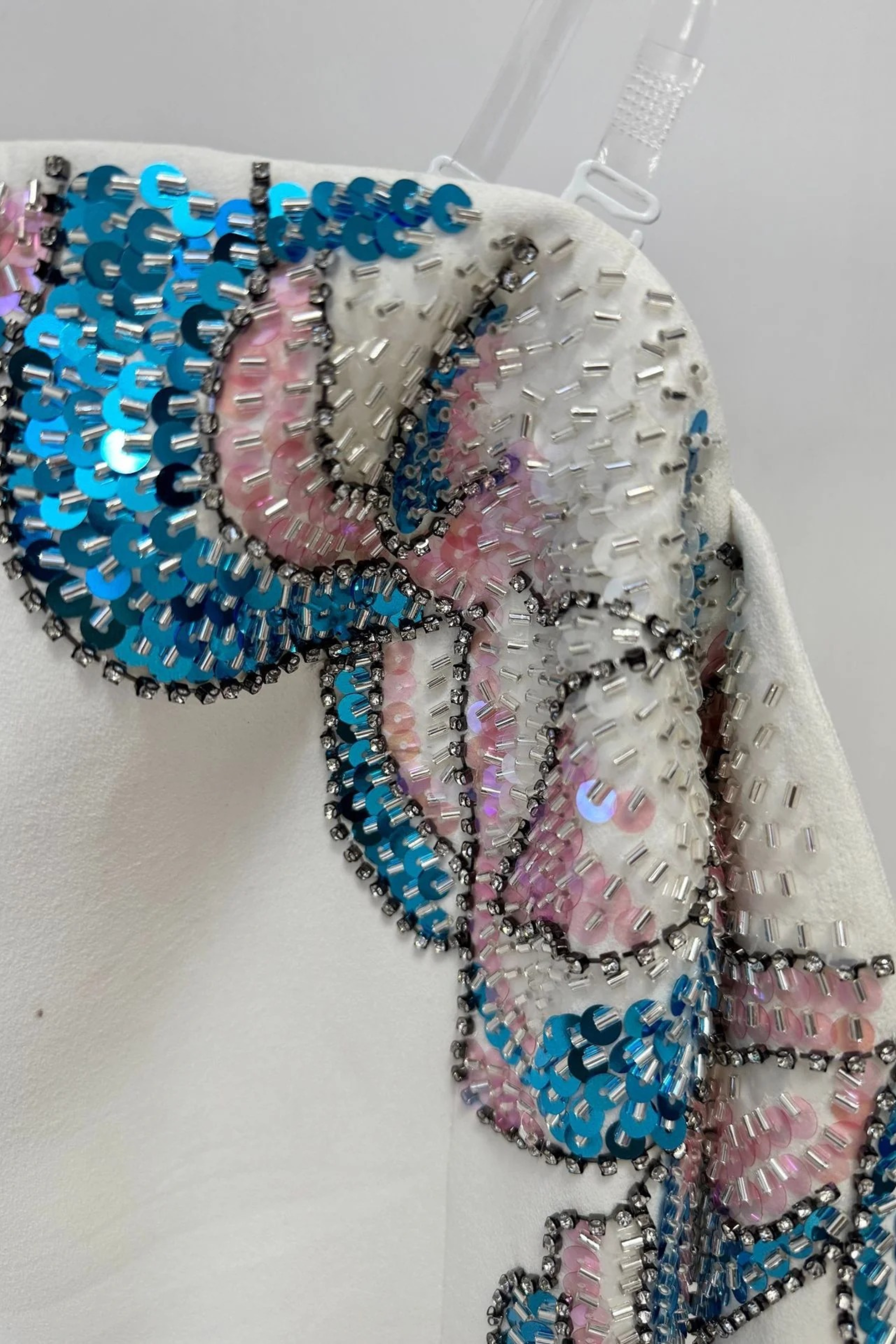 The silhouette is fitted through the bodice and hips, flowing into a graceful floor-length skirt that enhances the body’s natural shape. Clear adjustable straps are added for secure support while keeping the off-shoulder design in place.