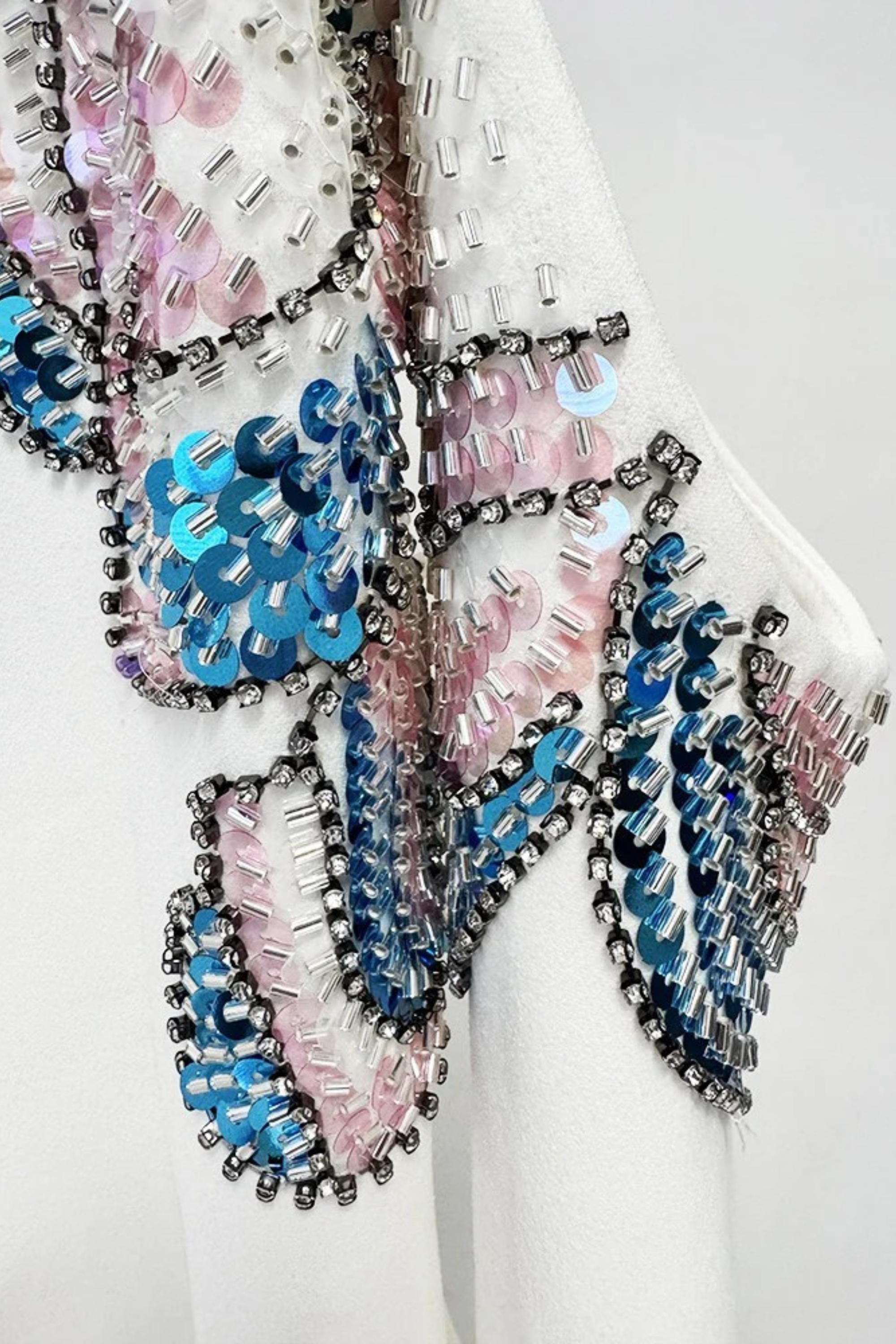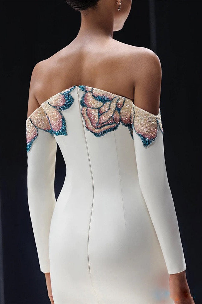 A luxurious statement gown crafted from smooth crepe fabric, designed with an elegant off-shoulder neckline and long sleeves. The top is fully hand-embellished with intricate floral beading in blue, pink, and silver tones, adding dimension and a soft shimmer to the look.