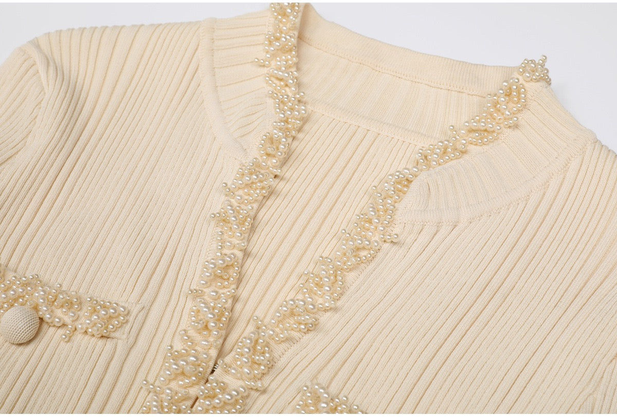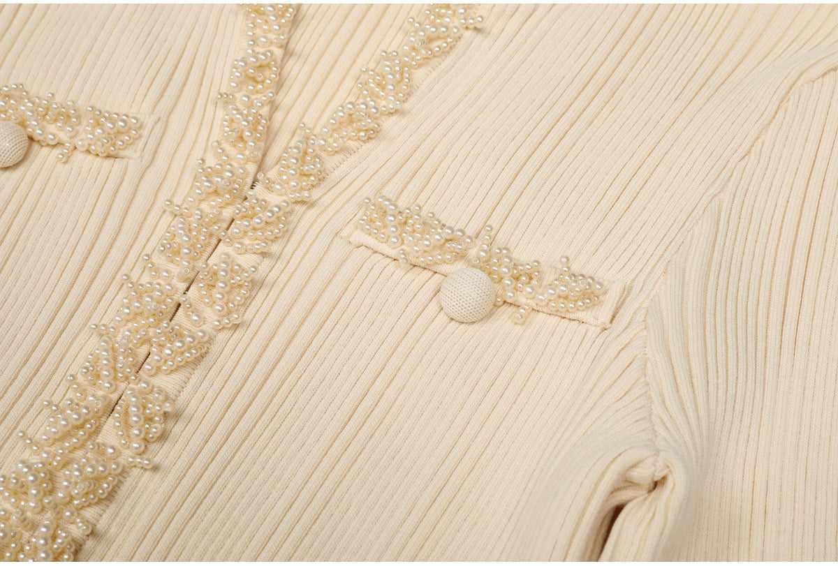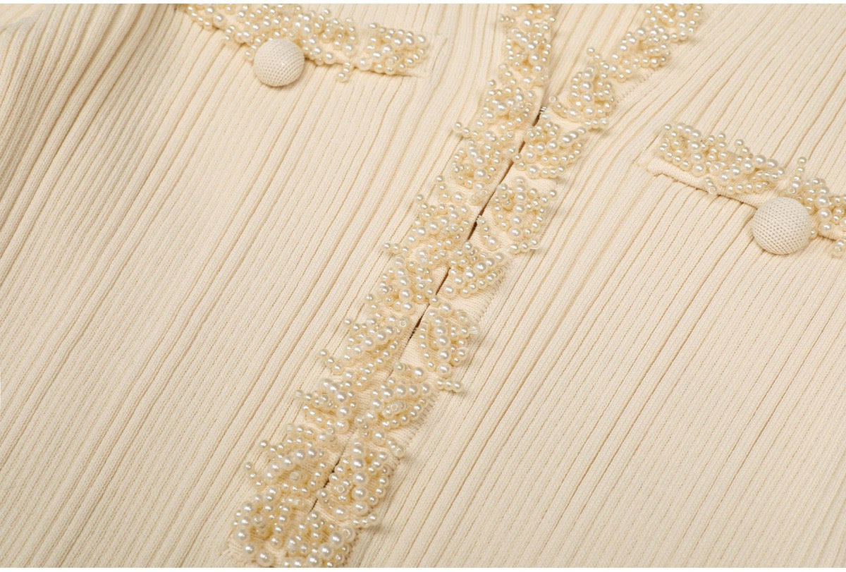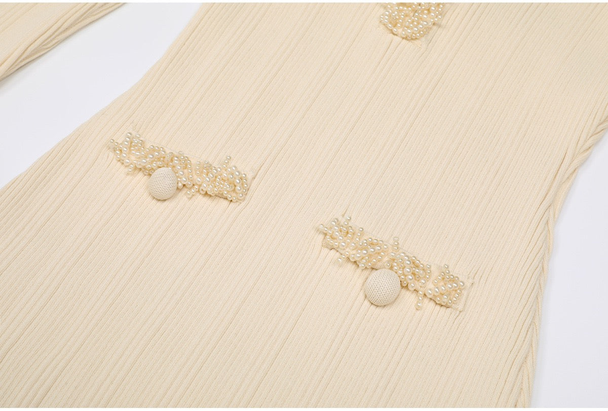 A refined long knit dress designed with delicate ribbed texture and elegant pearl trim accents. Crafted in a soft, structured fabric that flatters the silhouette, featuring long sleeves, a subtle neckline opening, and feminine pocket details. Effortlessly polished for daytime elegance or elevated evening styling.