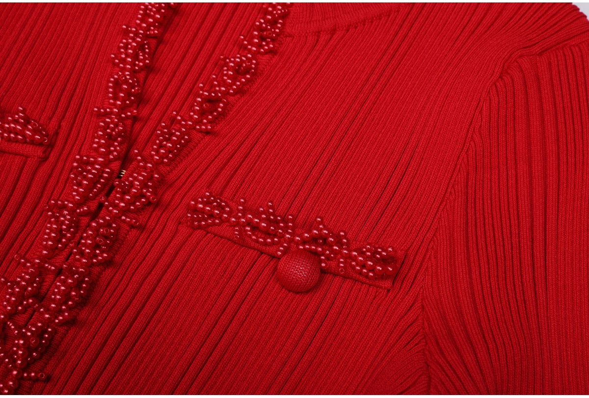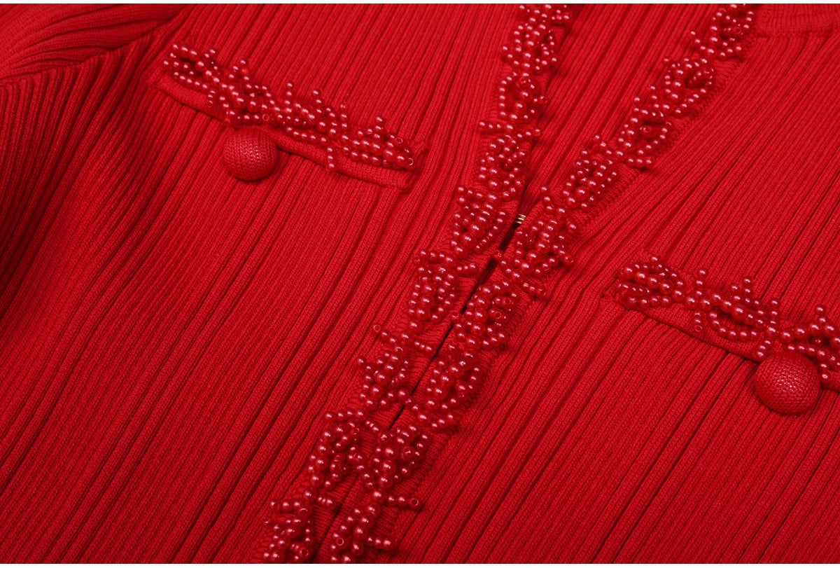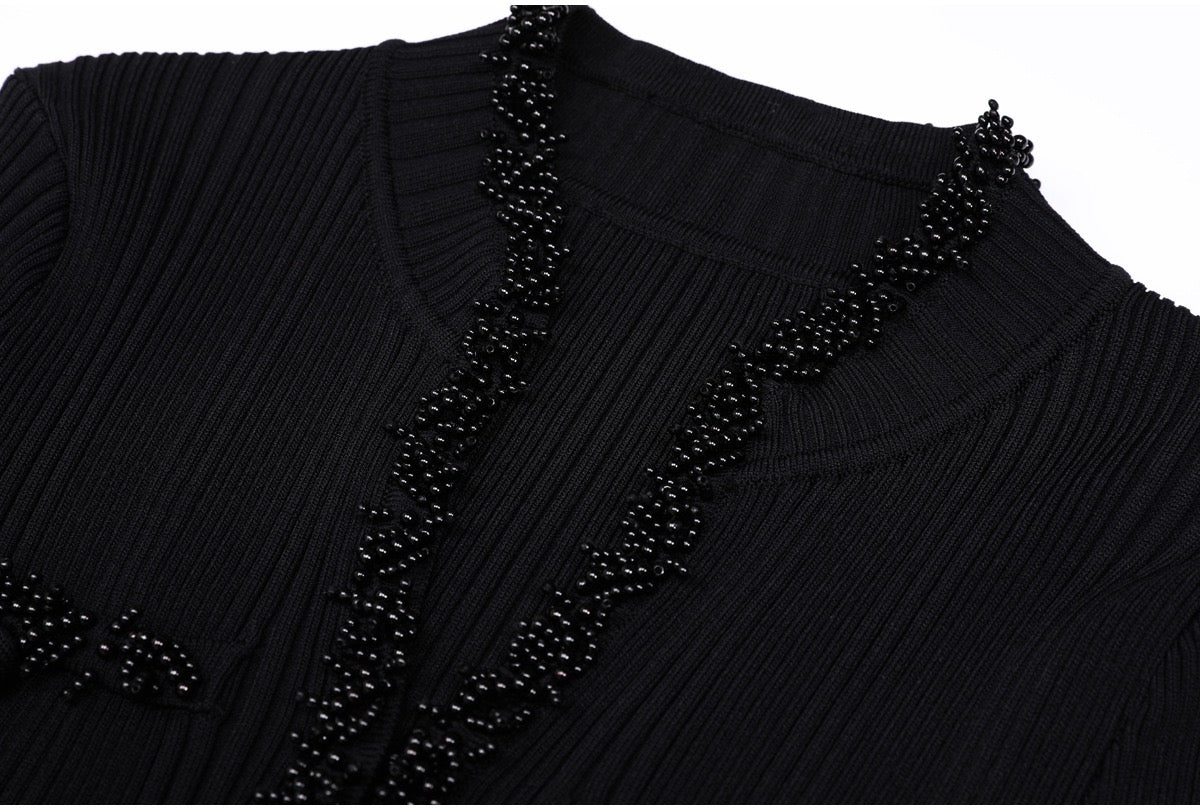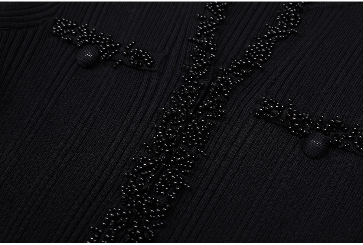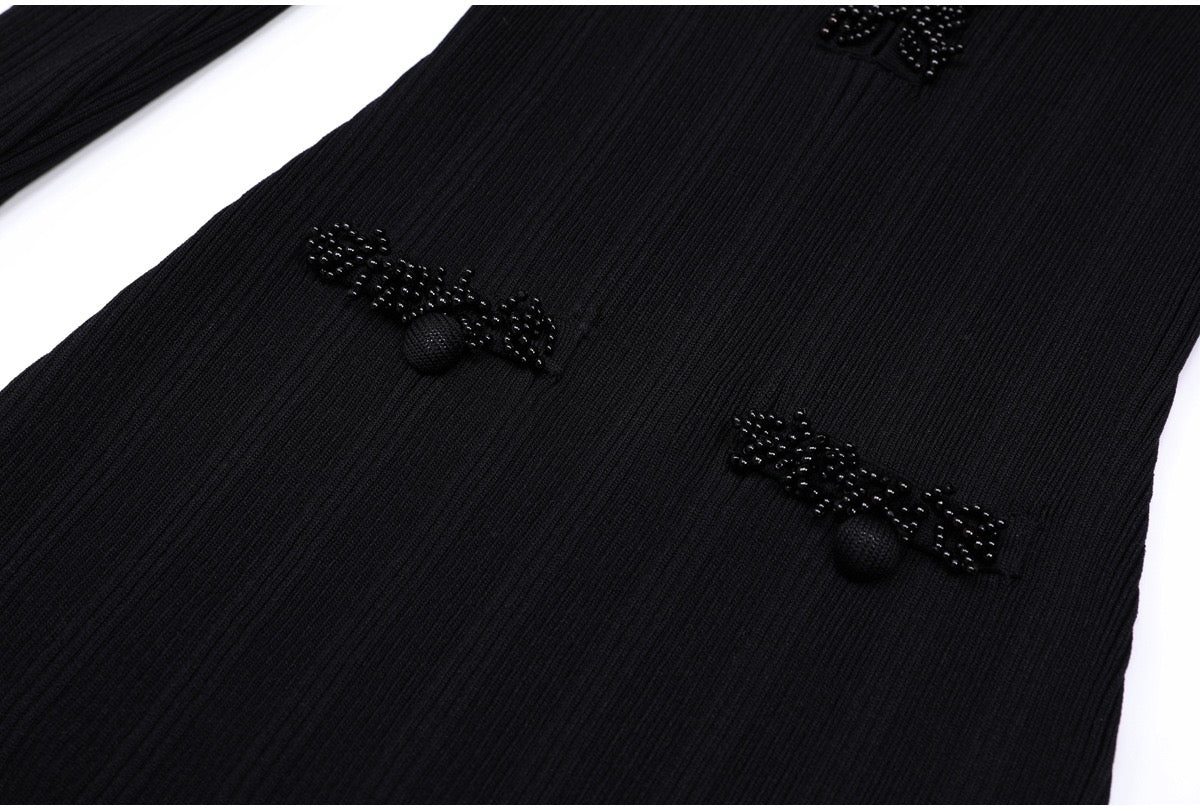 A refined long knit dress designed with delicate ribbed texture and elegant pearl trim accents. Crafted in a soft, structured fabric that flatters the silhouette, featuring long sleeves, a subtle neckline opening, and feminine pocket details. Effortlessly polished for daytime elegance or elevated evening styling.